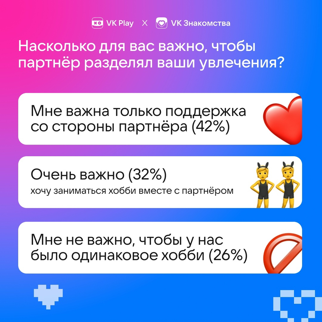 Мужчины чаще видят в играх объединяющий фактор: 41% уверены, что совместный гейминг сближает, тогда как среди женщин таких только 18%. 27% девушек опасаются, что увлечение партнёра играми может создавать напряжение, а 23% считают, что всё зависит от личных договорённостей. Для большинства важна поддержка: 42% хотят одобрения увлечения со стороны партнёра, 32% хотят заниматься хобби вместе, а 26% считают совпадение увлечений не обязательным.