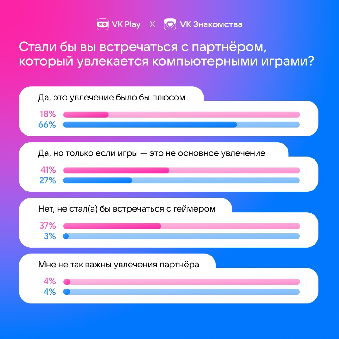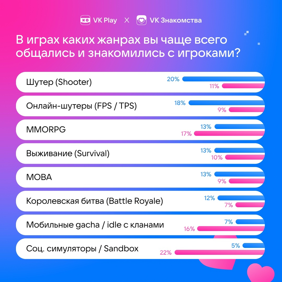 Дейтинг-сервис VK Знакомства совместно с платформой VK Play выяснили, как видеоигры влияют на знакомства, общение и романтические отношения россиян. Оказалось, что у 21% участников опроса отношения начинались с человеком, с которым они играли в одну игру. Чаще всего новые знакомства возникают в шутерах, онлайн-шутерах и MMORPG.