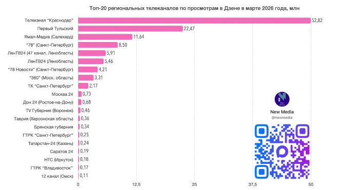 Аналитики New Media подвели итоги активности региональных каналов в Дзене за март 2026 года. Рейтинг формировался по суммарному количеству просмотров публикаций и числу подписчиков среди каналов с аудиторией более 1000 человек. 47 канал вошел в число лидеров по охватам.