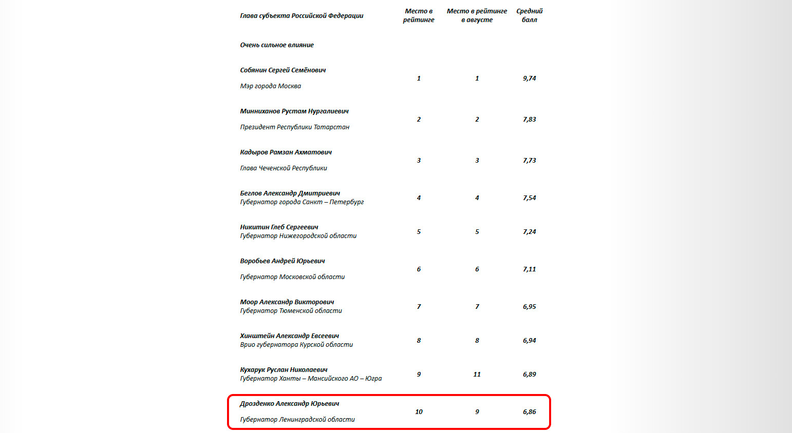 Агентство политических и экономических коммуникаций (АПЭК) опубликовало аналитический доклад "Рейтинг влияния глав субъектов РФ. Российские регионы и региональная политика в сентябре 2025 года". Губернатор Ленинградской области Александр Дрозденко занял в нём 10-е место.