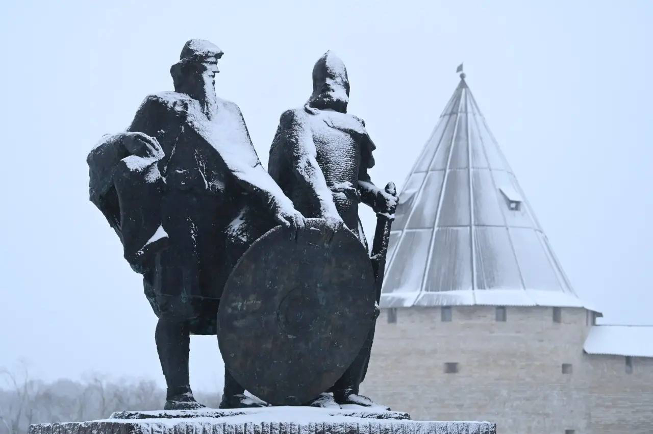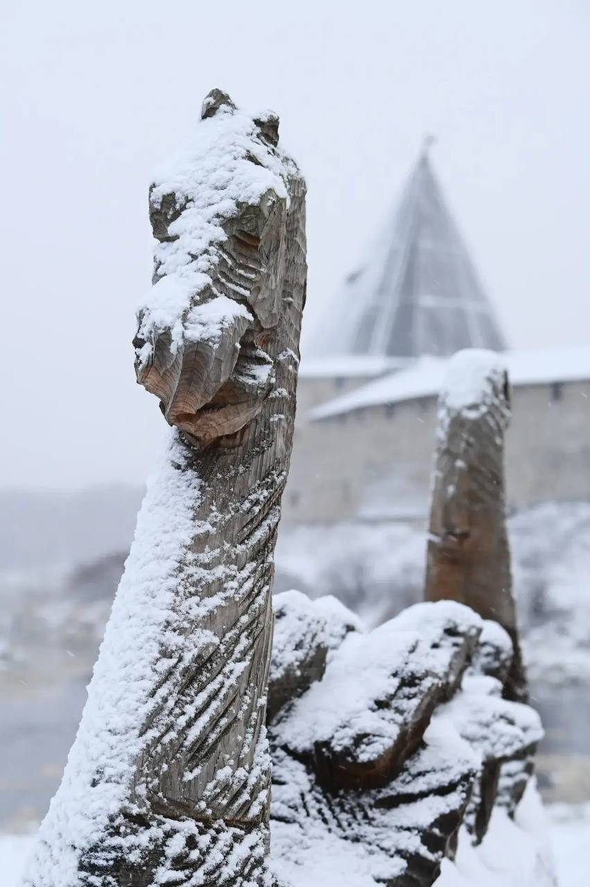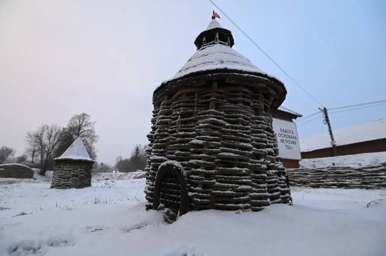 На фотографиях запечатлена заснеженная Старая Ладога. Белое покрывало укутало старинную крепость, памятник Великим русским князьям - Рюрику и Олегу Вещему, а также берега реки Волхов.