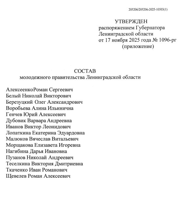 Губернатор Ленинградской области Александр Дрозденко утвердил новый состав молодёжного правительства 47 региона. В него вошли победители конкурса МПЛО: Роман Алексеенко, Николай Белый, Олег Березуцкий, Алина Воробьёва, Юрий Генчев, Варвара Дубовик, Виктор Иванов, Екатерина Лопаткина, Вячеслав Малюков, Елизавета Морщакова, Дарья Нагибина, Николай Пузанов, Виктория Теселкина, Иван Ткаченко и Роман Щевелев.
