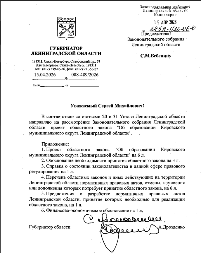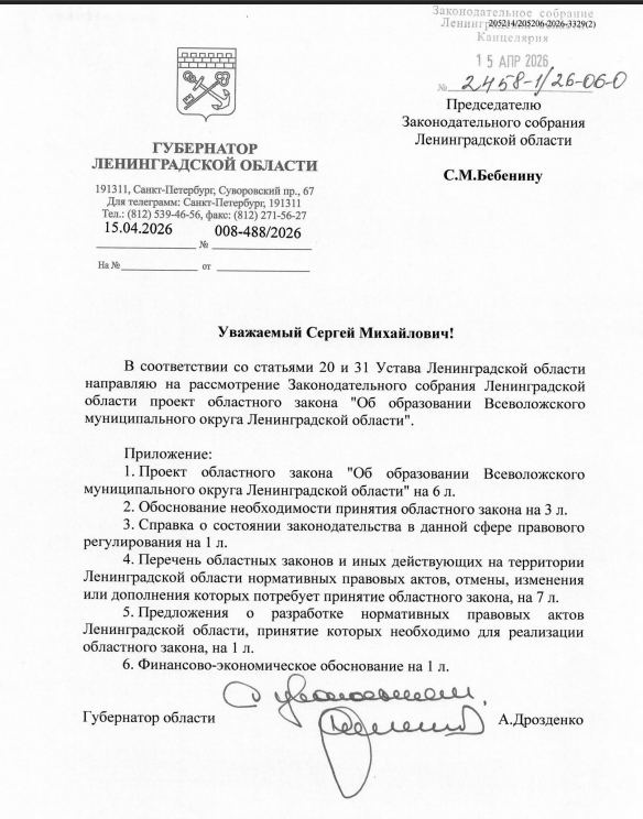 Губернатор Александр Дрозденко направил на рассмотрение ЗакСа проекты законов "Об образовании Всеволожского муниципального округа Ленинградской области" и "Об образовании Кировского муниципального округа Ленинградской области". Тексты размещены на сайте регионального парламента.