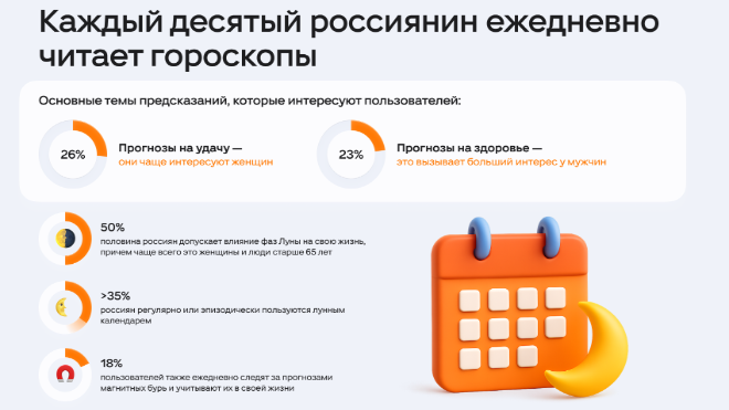 Самыми популярными темами гороскопов стали прогнозы на удачу (26%) — чаще интересуют женщин, и на здоровье (23%) — больше привлекают мужчин. 42% респондентов читают гороскопы, чтобы сравнить прогнозы с реальностью, 28% — для развлечения и поднятия настроения. Старшее поколение чаще делает это по привычке, а пользователи до 44 лет — для помощи в принятии решений.