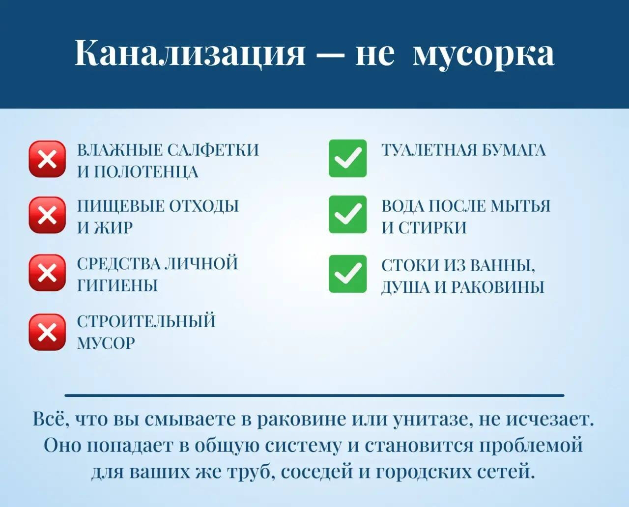 Отметим, причиной засоров могут стать остатки еды, средства гигиены, влажные салфетки и бытовой мусор. В пресс-службе Леноблводоканала напоминают, что канализация предназначена только для туалетной бумаги, воду после стирки и стоков из ванной или душа.