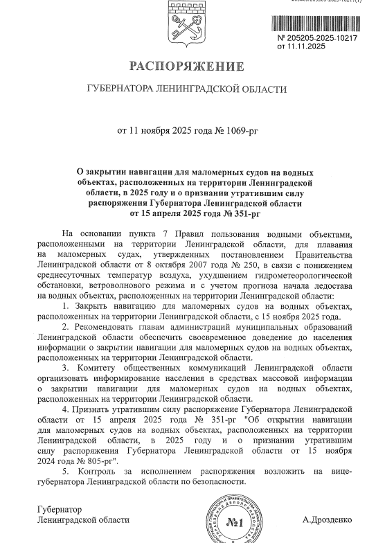 С 15 ноября в Ленинградской области закрывается навигация для маломерных судов — лодок, катеров и гидроциклов. Распоряжение об этом подписал губернатор Александр Дрозденко.