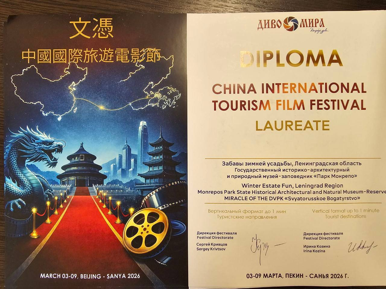 Короткометражный фильм «Монрепо от создателя» завоевал первый приз Международного туристического кинофестиваля «Диво Мира 2026». Лента из Ленинградской области стала лучшей в номинации «Туристические направления».