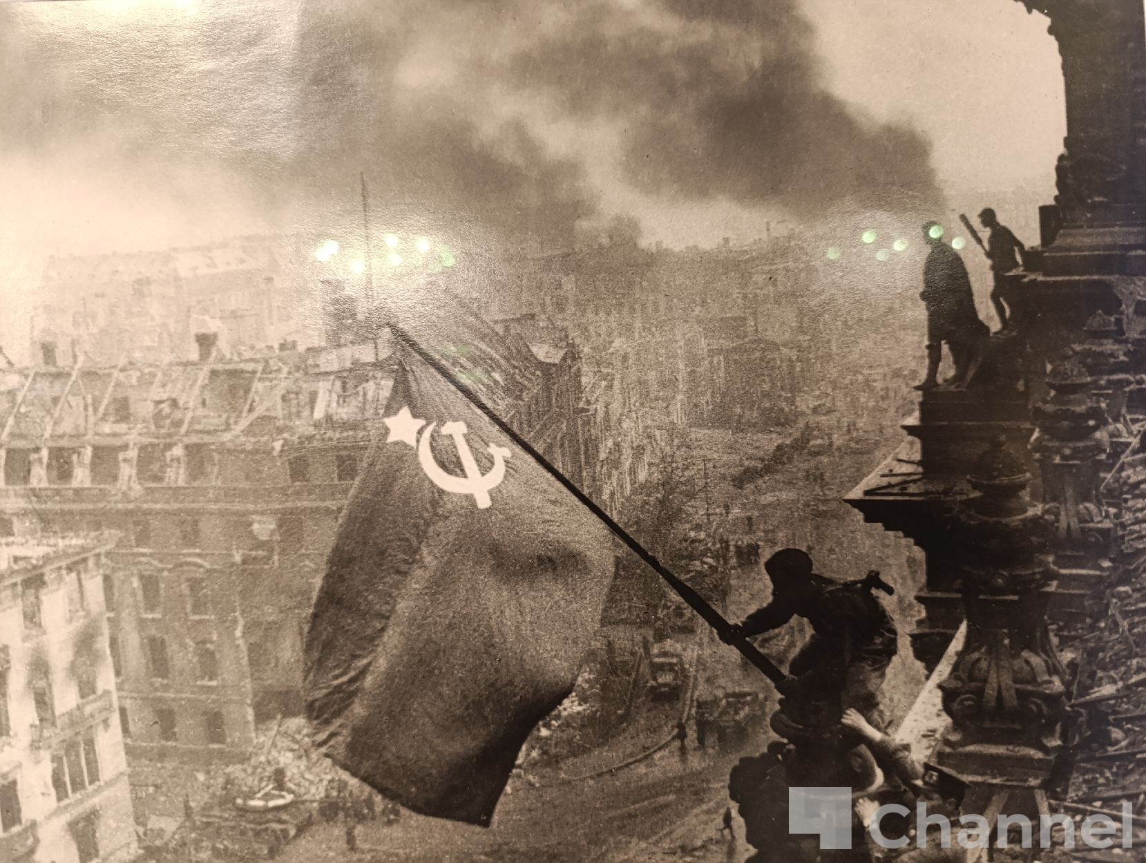 Галерея Art of Foto, официальный хранитель архивов Халдея, передала 47 региону еще один снимок знамени Победы над Рейхстагом, сделанный в Берлине.