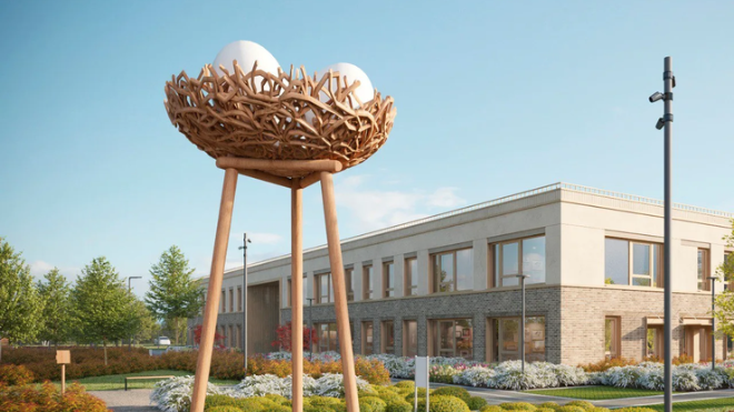 Архитектурная концепция детского сада строится на образе "родительского гнезда" — безопасного и тёплого пространства для первых шагов ребёнка во взрослый мир. Здание рассчитано на 10 изолированных групповых ячеек с раздевалками, игровыми, спальнями и буфетными. Здесь предусмотрены музыкальный и спортивный залы, помещения для кружков и коррекционных занятий, кабинеты специалистов, медицинский и пищеблоки, прачечная. На территории оборудуют детские площадки разных возрастов, теневые навесы, спортивную зону и велопарковку. Проект ориентирован на создание комфортной, понятной и доброжелательной среды для развития детей.