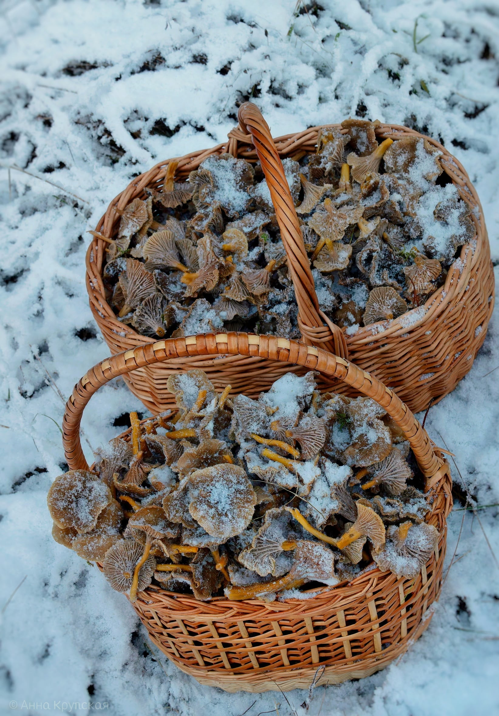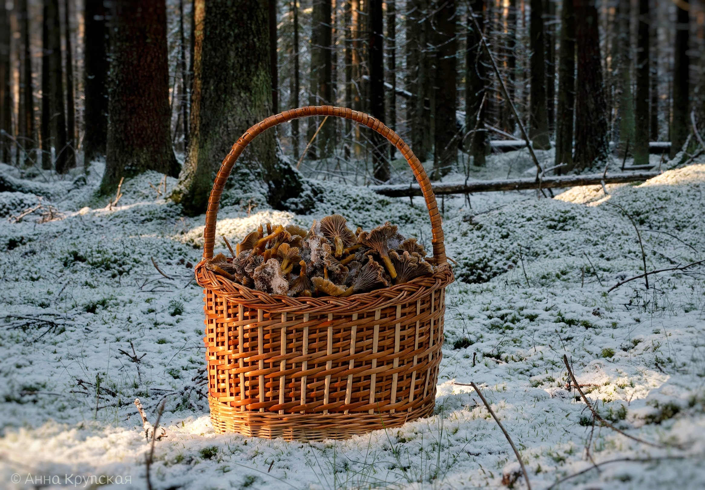 Как отмечают грибники, в лесу - тихо и сыро. А еще - снежно, солнечно и местами загадочно. Грибы звенят, словно стеклянные. Многие уже укрылись снегом.