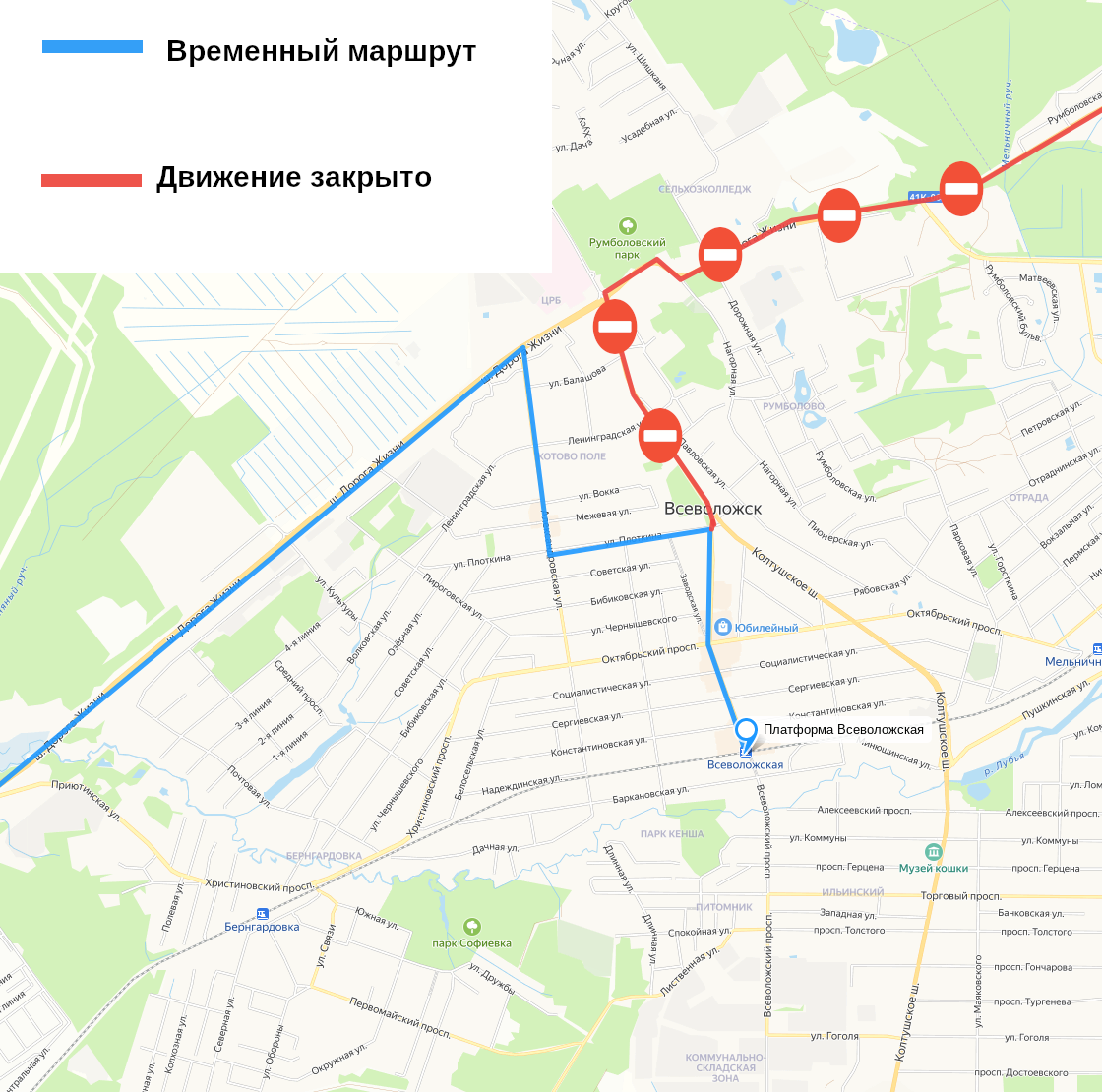 В этот день маршрут № 462 "Рахья — Ладожская" будет работать по сокращённой схеме. Часть рейсов из Рахьи и Углово отменят, а отправление автобусов будет организовано только от остановки "Платформа Всеволожская". Далее транспорт пойдёт через Всеволожский проспект и улицу Плоткина с выходом на привычный маршрут у остановки "Заводская улица". Автобусы из Санкт-Петербурга до 18:35 будут доезжать лишь до остановки "Всеволожск — Котово поле", после чего следовать к "Платформе Всеволожская". В сторону Рахьи и Углово движения в это время не будет.
