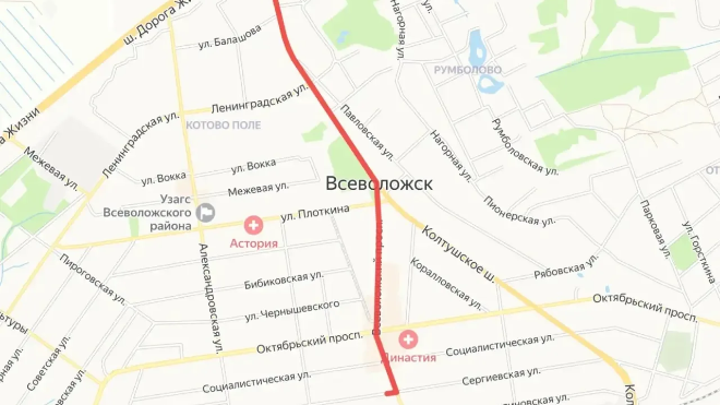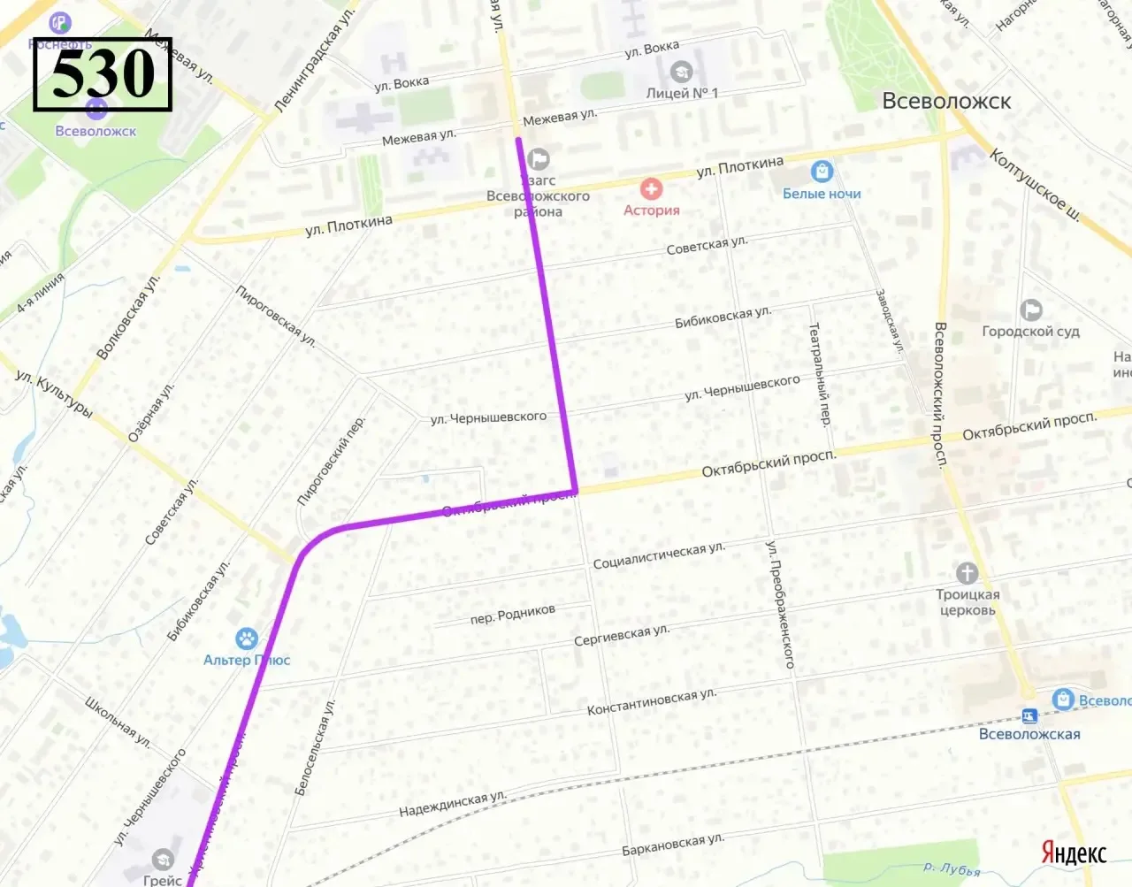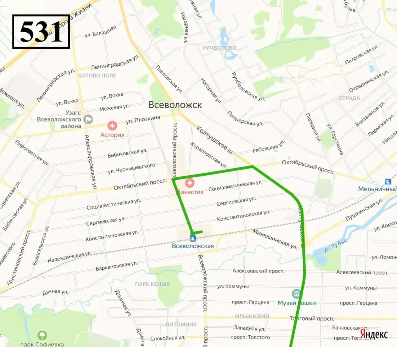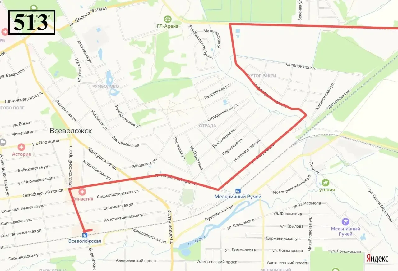 Схема движения: Всеволожский пр. → Октябрьский пр. → Колтушское ш., далее по основной трассе. Обратное направление — по той же схеме.