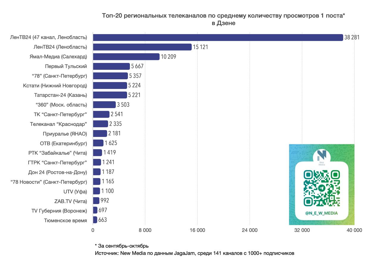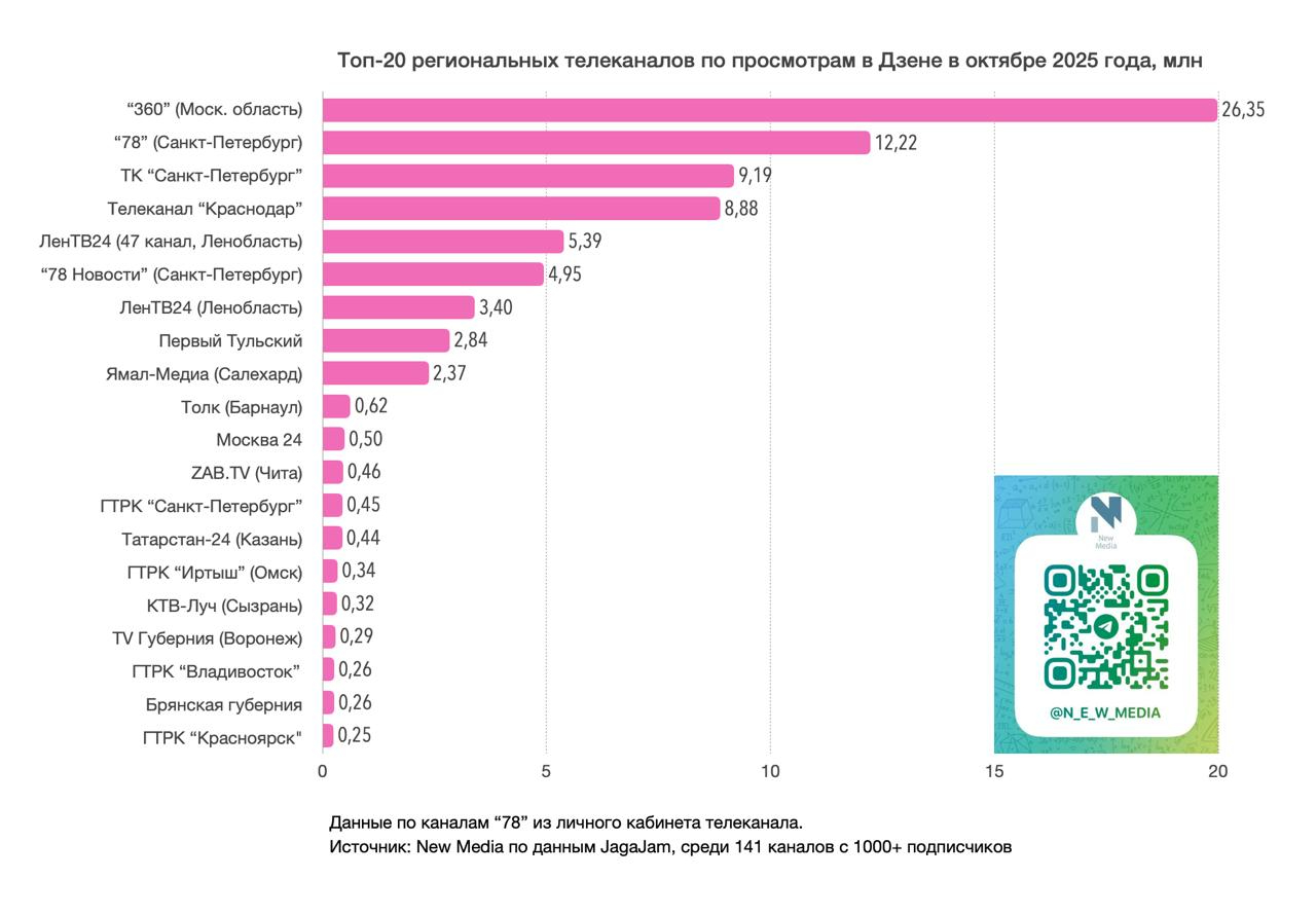 Аналитики New Media составили рейтинг региональных телеканалов в Дзене за октябрь 2025 года. Оценивали количество просмотров, среднее количество прочтений одной публикации, процент читающих и количество подписчиков на конец месяца. В выборку попал 141 канал с более тысячью подписчиков.