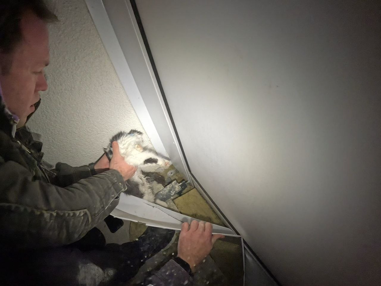 Добравшись до балкона, спасатели вручную разобрали часть внутренней обшивки и утеплителя. Кошку удалось осторожно «пропихнуть» в получившуюся щель. К этому моменту бедолага не двигалась и была ледяной на ощупь, но жалобно мяукала.