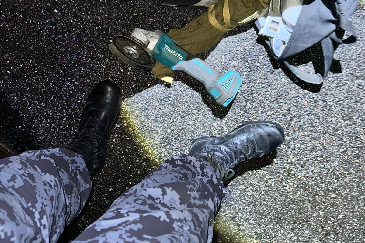 Сотрудники Росгвардии быстро нашли всех четверых во дворе домов на Варшавской улице. У них изъяли рюкзаки с веревками и инструментами, включая аккумуляторную угловую шлифовальную машину.
