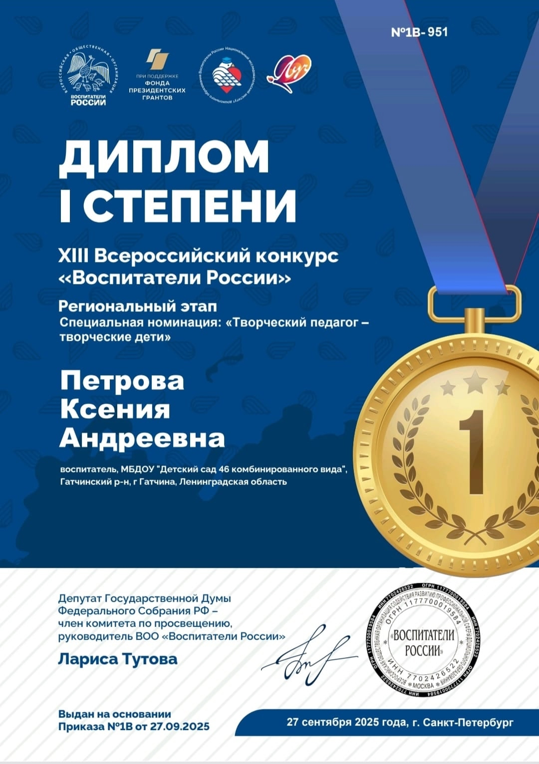 Ксению Петрову признали лучшей в номинации «Творческий педагог - творческие дети». Победа позволила воспитателю выйти в финал конкурса «Воспитатели России», который пройдет с 1 по 31 октября 2025 года.