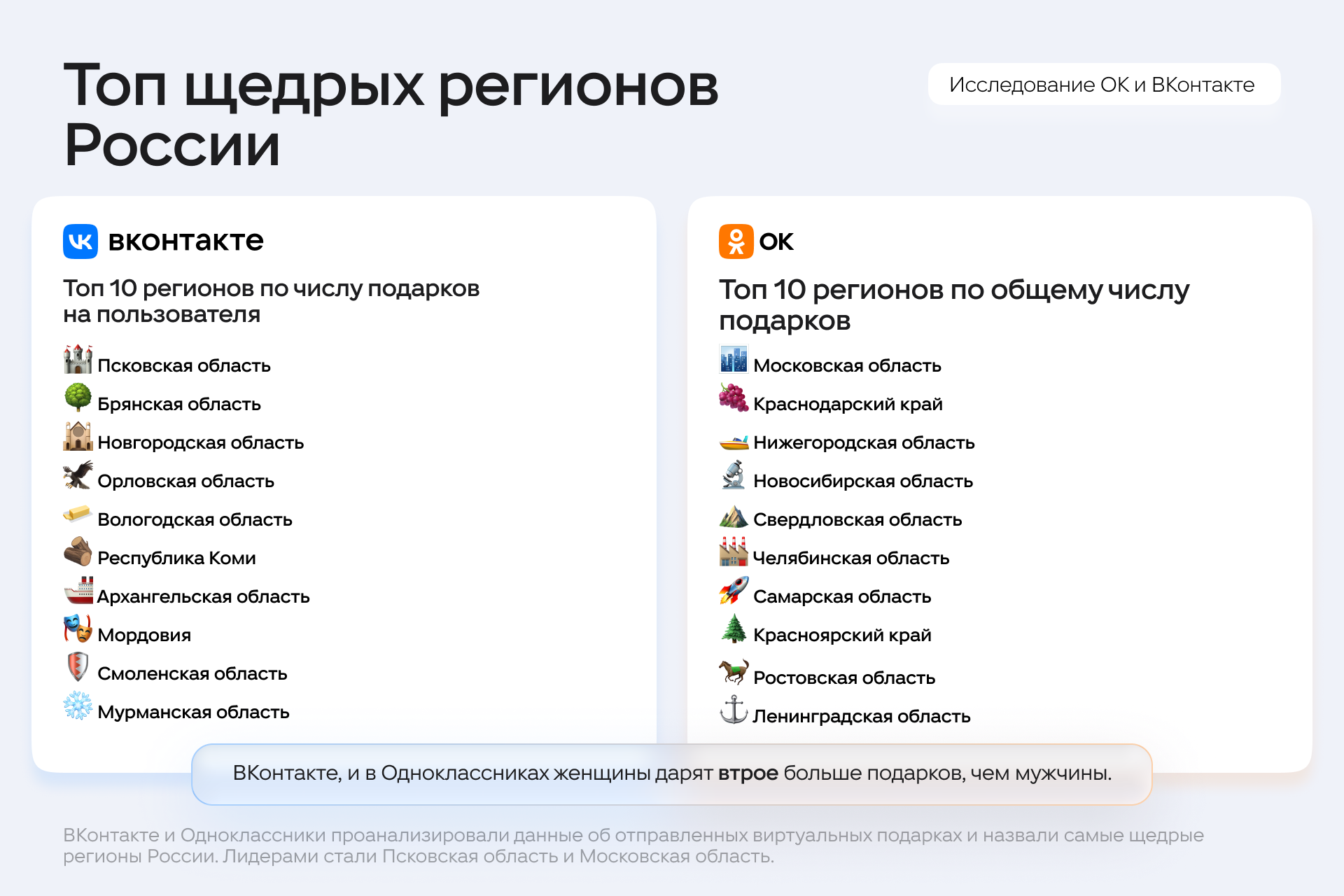 По данным "ВКонтакте", лидером стала Псковская область — 12,2 подарка на пользователя в год. В десятку вошли также Брянская, Новгородская, Орловская, Вологодская, Архангельская области, Республика Коми, Мордовия, Смоленская и Мурманская области.