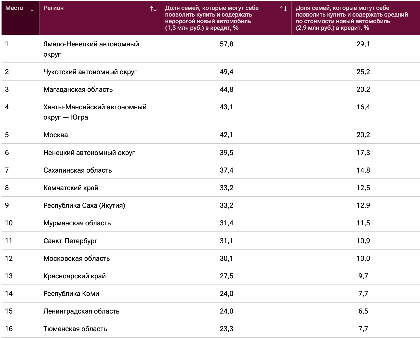 При этом в разных регионах страны доступность покупки автомобиля оказалась очень дифференцирована. Для оценки различий эксперты вычислили долю семей, которые могут ежемесячно платить по кредиту, тратить деньги на надлежащее содержание машины и осуществлять повседневные расходы.