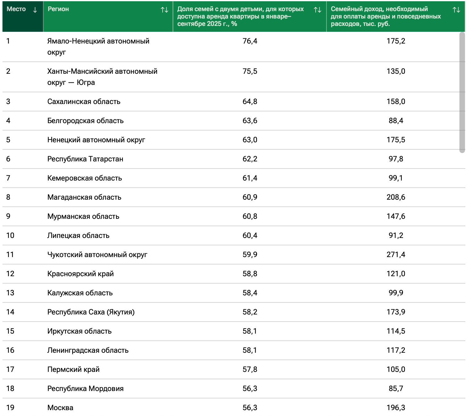 При составлении рейтинга эксперты выяснили, какая доля семей с двумя детьми в каждом регионе России может позволить себе арендовать двухкомнатную квартиру. При этом учитывалась необходимость повседневных расходов.