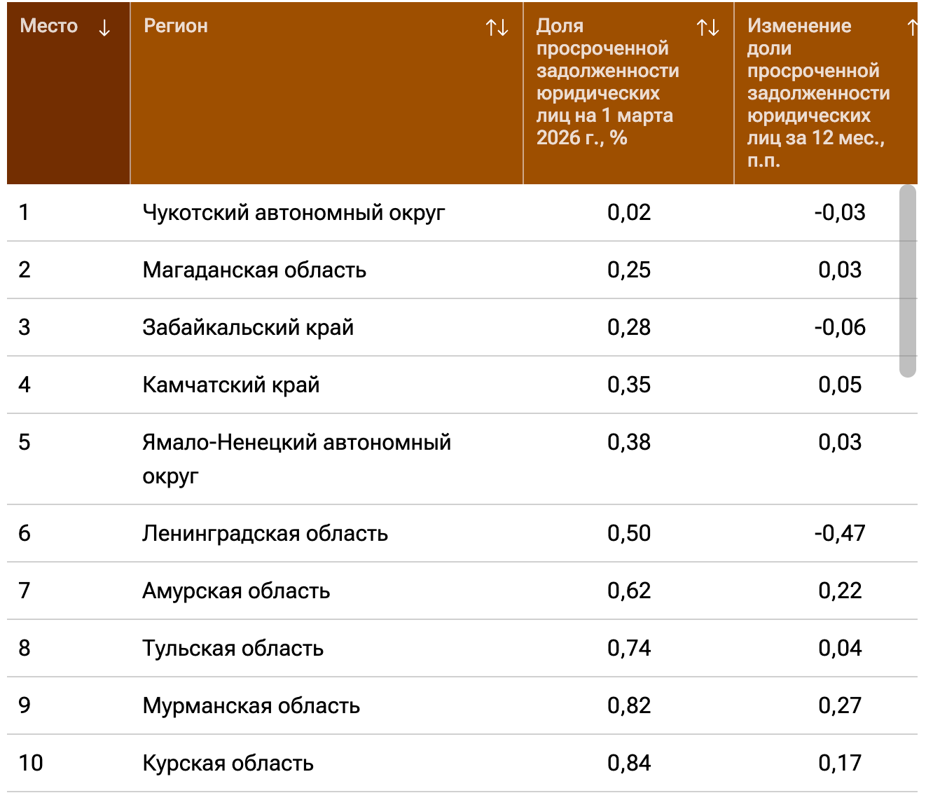 Лидером по минимальному уровню просроченной задолженности по кредитам, выданным юридическим лицам, с показателем в 0,02% стал Чукотский АО. В пятерку лидеров также вошли Магаданская область (0,25%), Забайкальский край (0,28%), Камчатский край (0,35%) и Ямало-Ненецкий АО (0,38%).