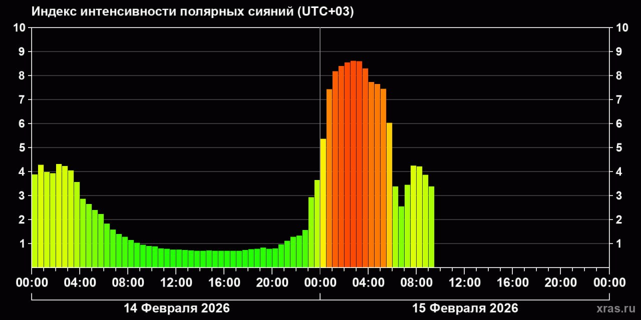 Последняя магнитная буря в феврале 2026 года зафиксирована 5 числа, а затем геомагнитный фон был спокойнее, чем в январе с его рекордным количество бурь за последнее десятилетие. Нынешняя буря может продолжаться до двух суток, но с перерывами. Сильные вспышки маловероятны.