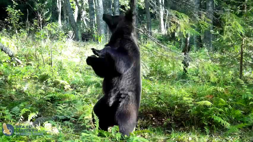 Перед фотоловушкой предстал взрослый самец. Он встал на задние лапы, чтобы внимательно рассмотреть незнакомый предмет. Убедившись в безопасности камеры, косолапый удалился.