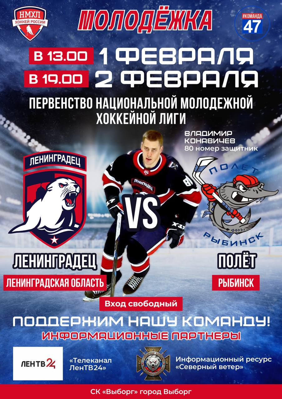 В Выборге пройдут домашние матчи молодежного хоккейного клуба "Ленинградец" с командой "Полёт" из Рыбинска (Ярославская область). Первое домашнее противостояние состоится 1 февраля в 13:00, второй матч — 2 февраля в 19:00.
