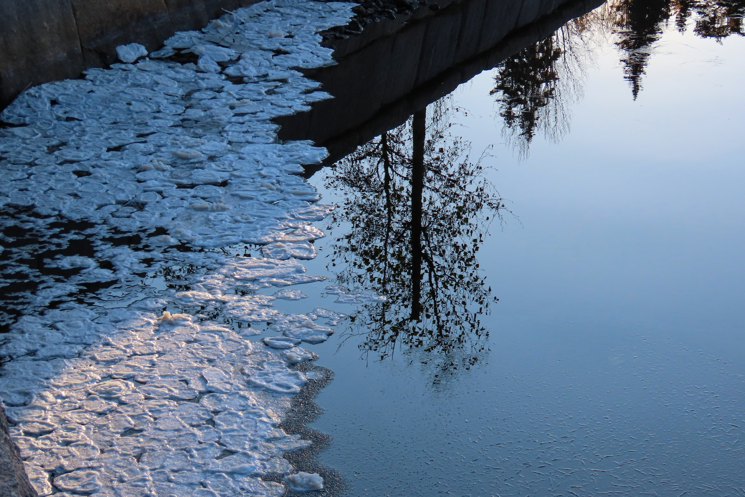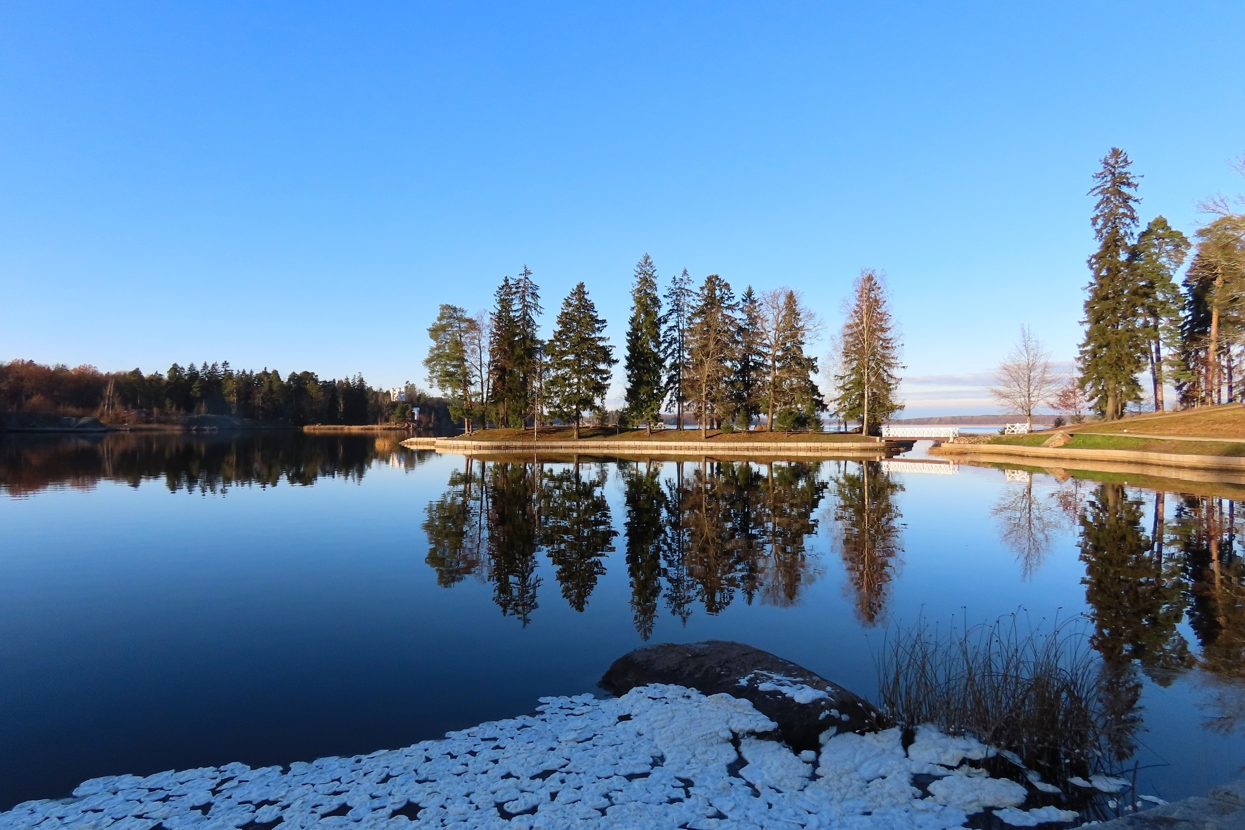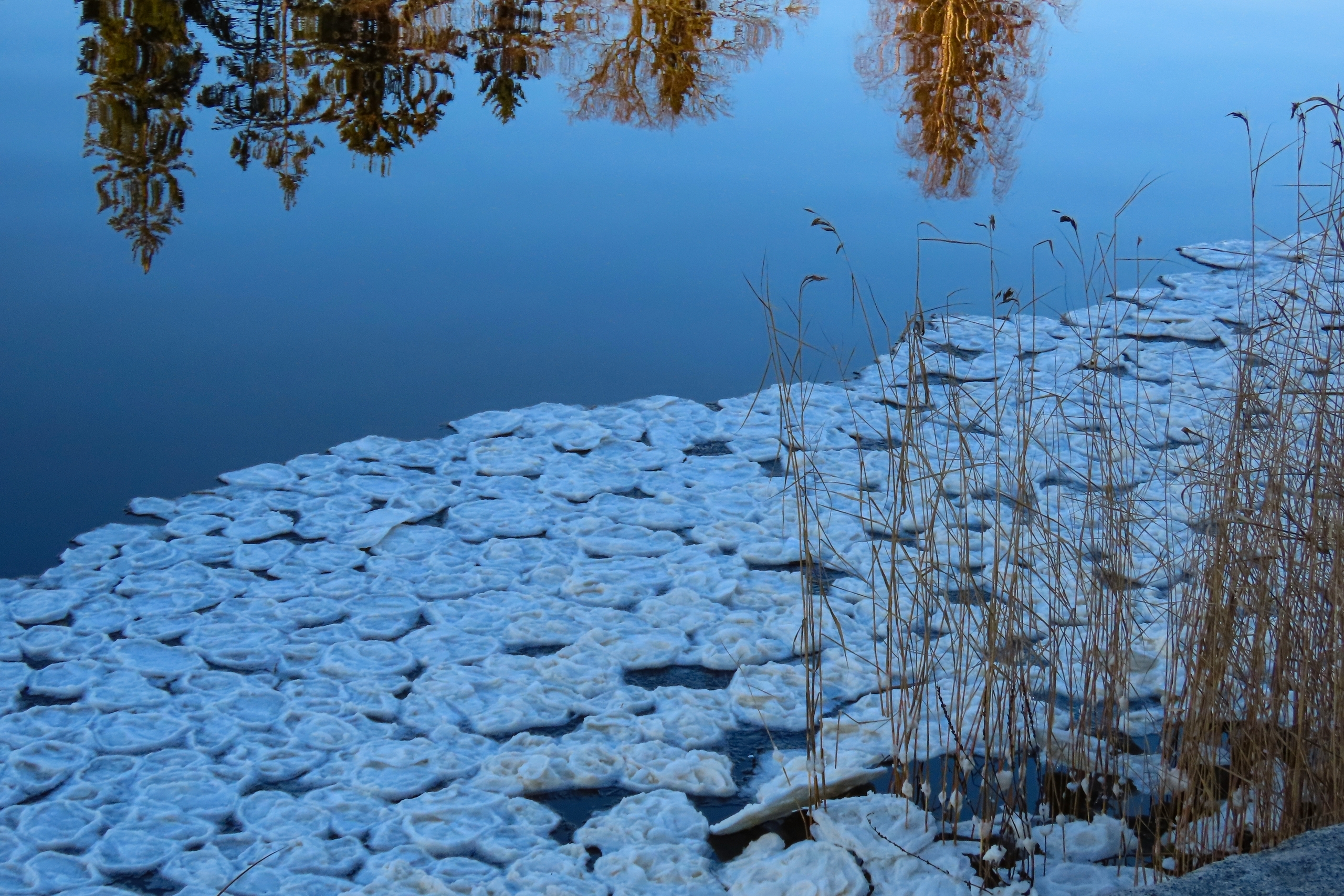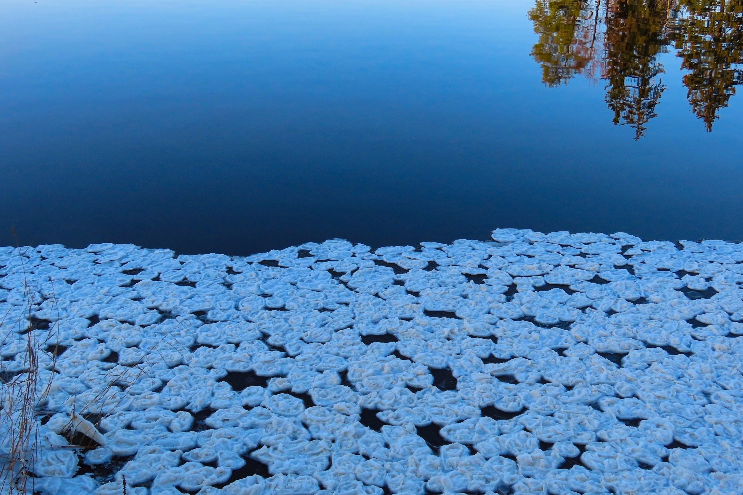 В музее-заповеднике "Парк Монрепо" появились ледяные "блинчики" на воде. Они возникают, когда температура воздуха опускается к нулю: на поверхности образуется ледяная кашица, которая под действием ветра и течений разделяется, обтачивается и слипается в круглые лепешки.