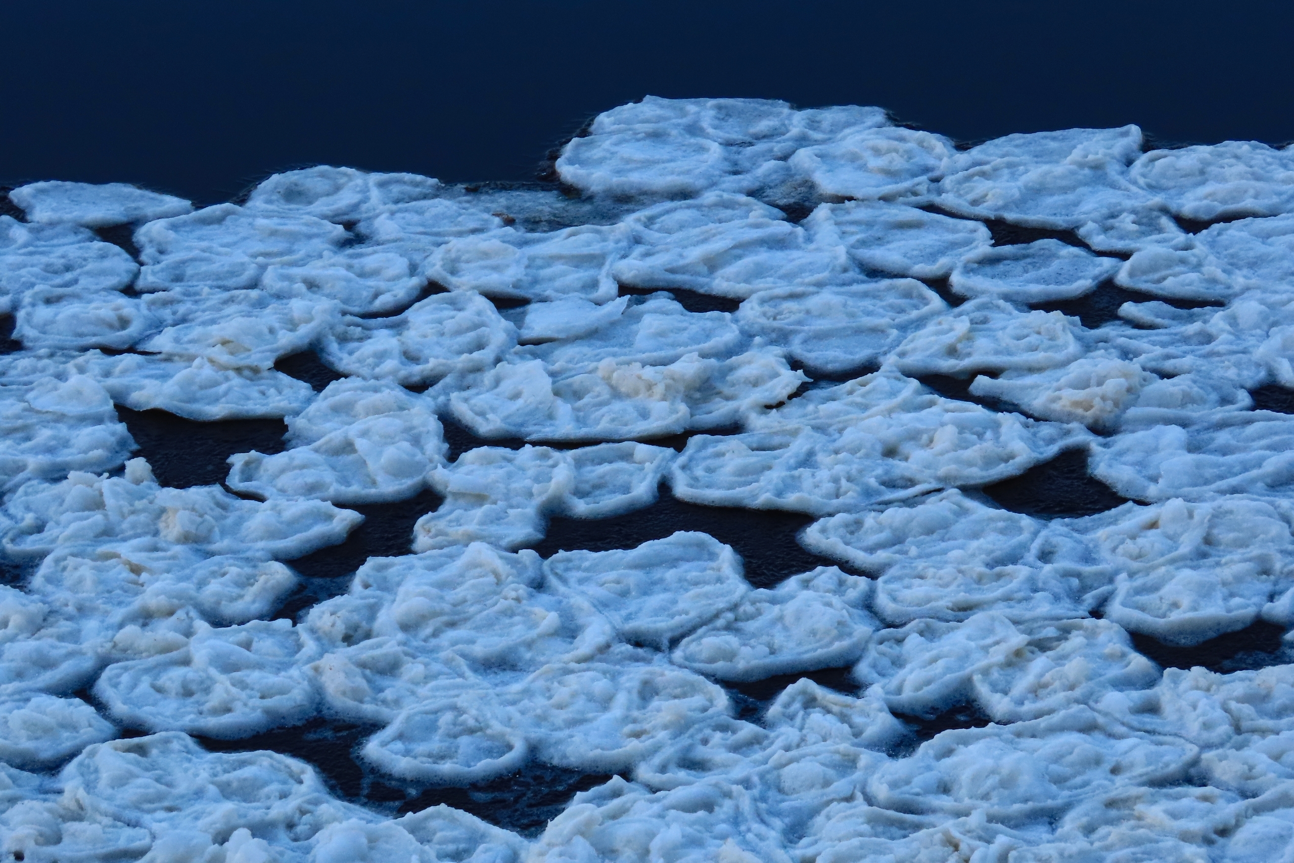 Льдины имеют диаметр от 30 см до 3 метров и толщину до 15 см. Такое явление называют "блинчатым льдом" и оно встречается крайне редко.