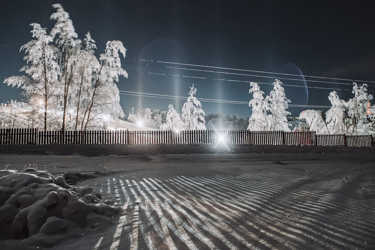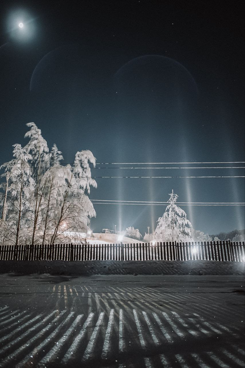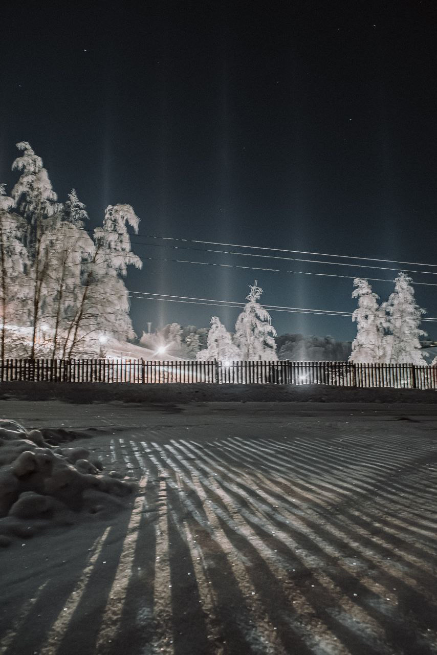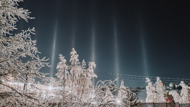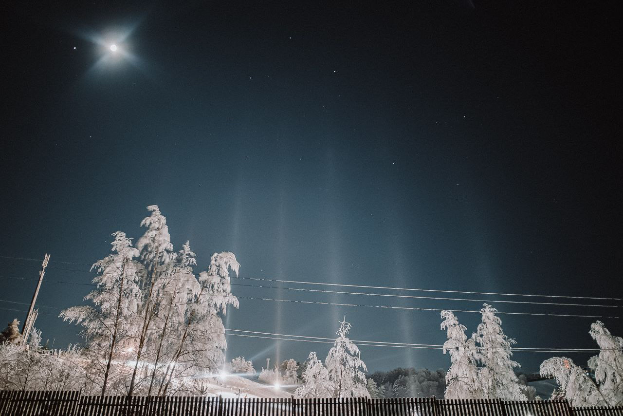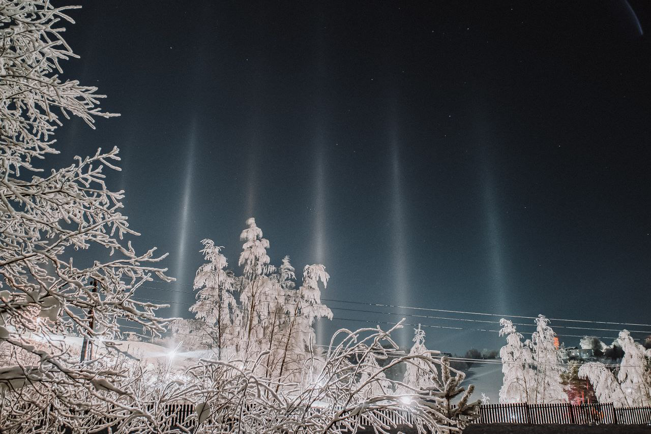 Для появления световых столбов необходим сильный мороз, отсутствие ветра и наличие влажности, а также источник освещения. Если хоть один параметр не совпадает, то наблюдать эту оптическую иллюзию не получится.