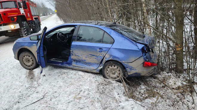 В понедельник, 15 декабря, около 10:40 на Южном шоссе во Всеволожске (Ленинградская область) столкнулись два автомобиля. Синяя легковушка съехала в кювет, а белая с поврежденной передней частью - остановилась на обочине.