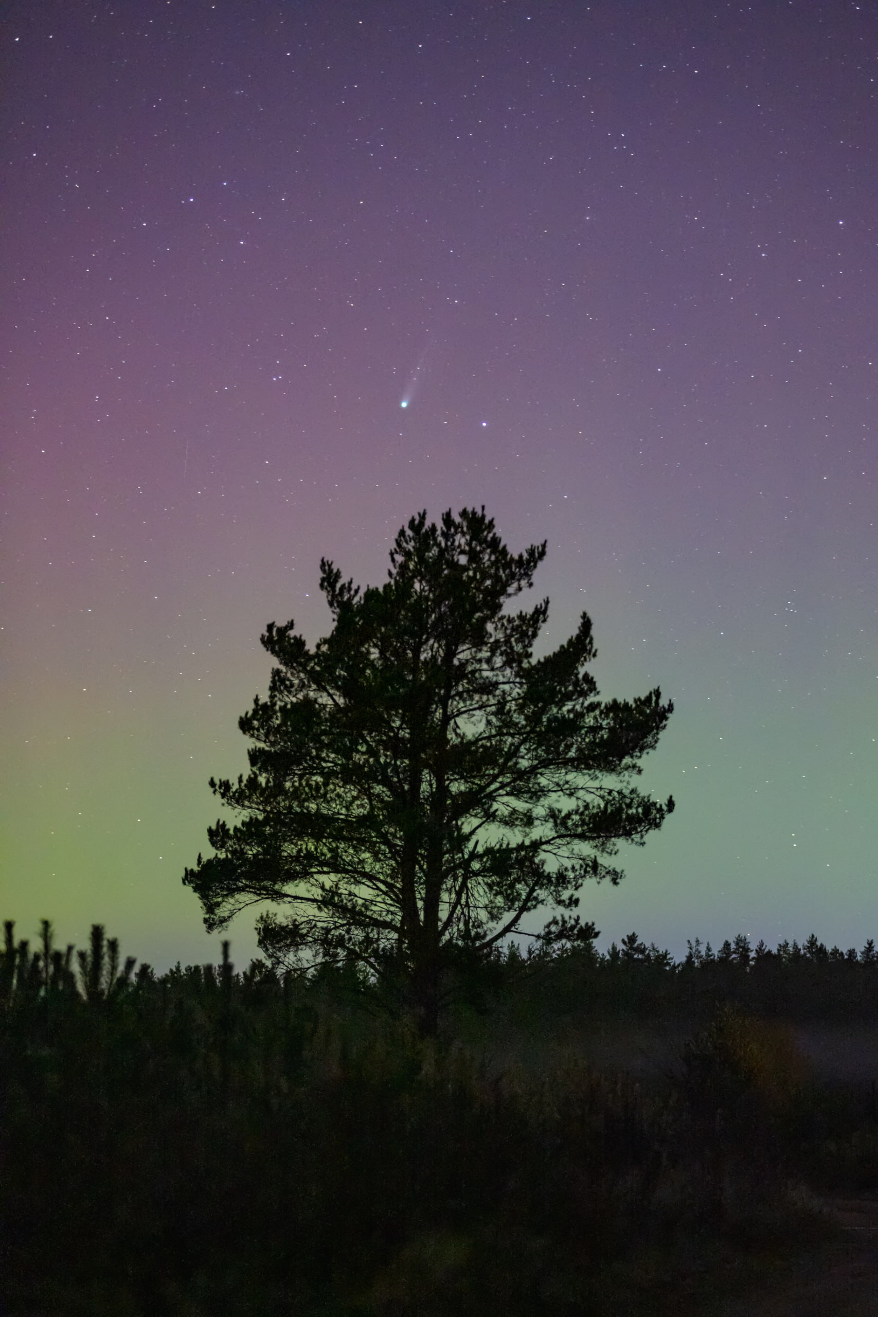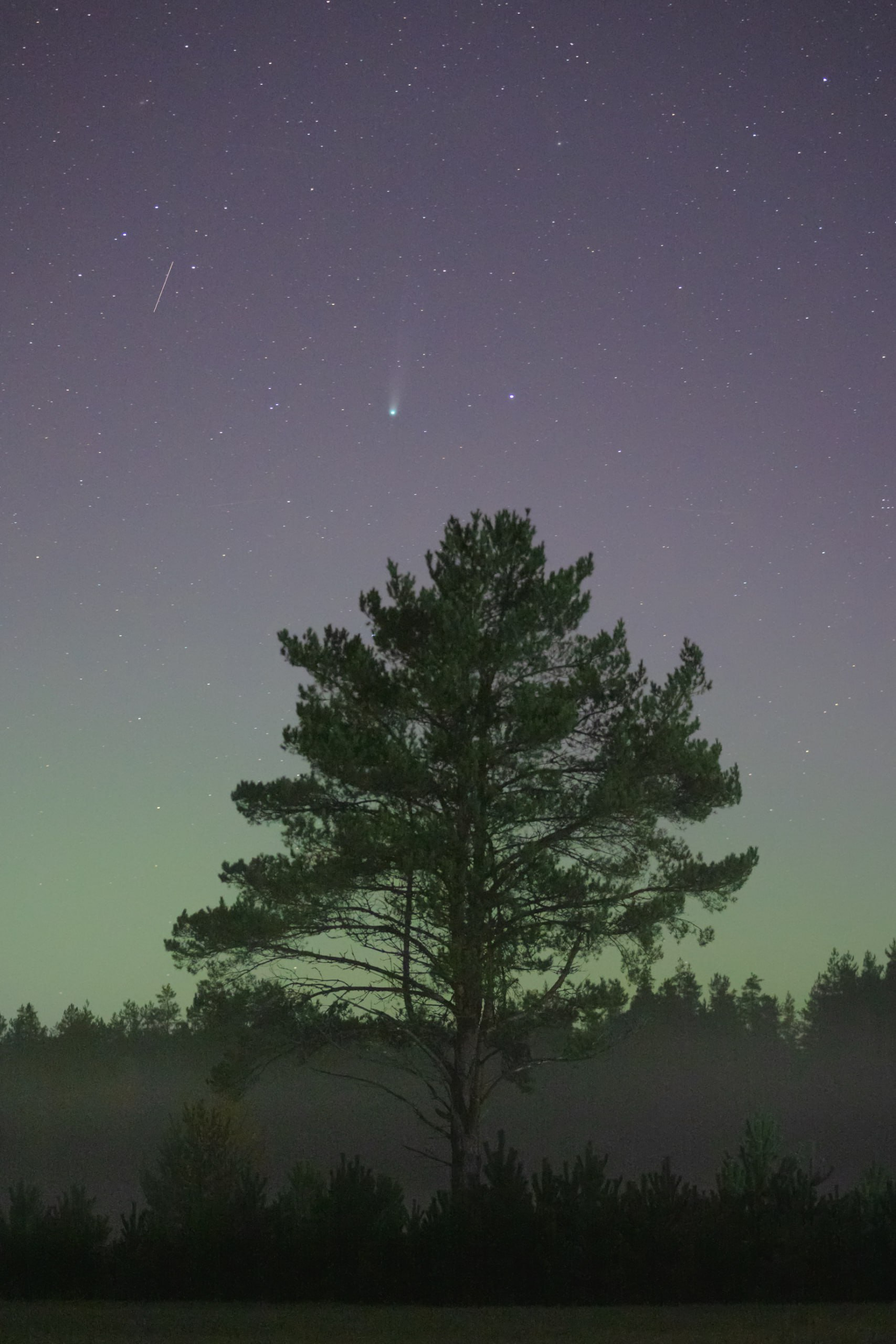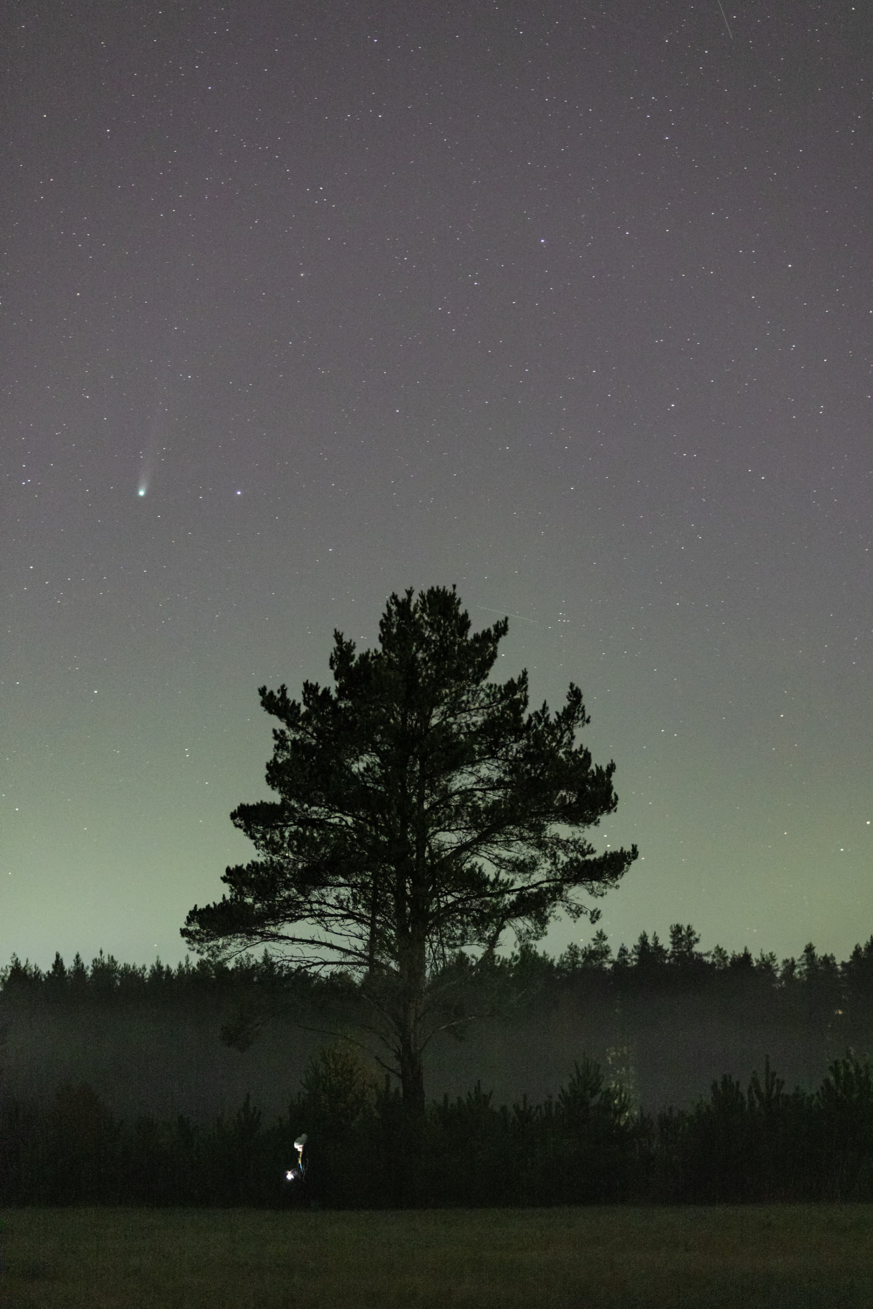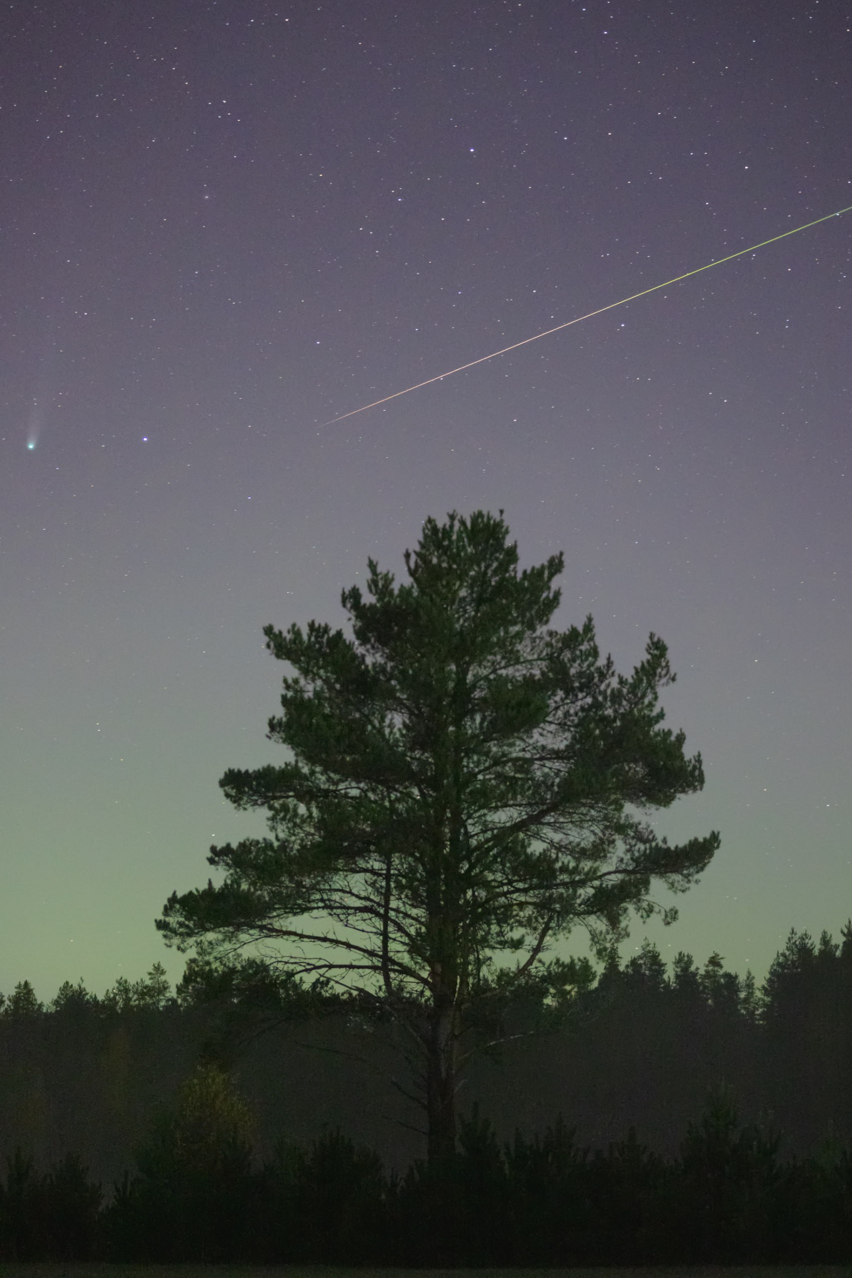 Лучше всего наблюдать за кометой - за городом, после заката и перед рассветом, так как городская дымка и свет фонарей мешают обзору. В это же время по небу летало множество метеоров, один из которых попал на кадр вместе с кометой.