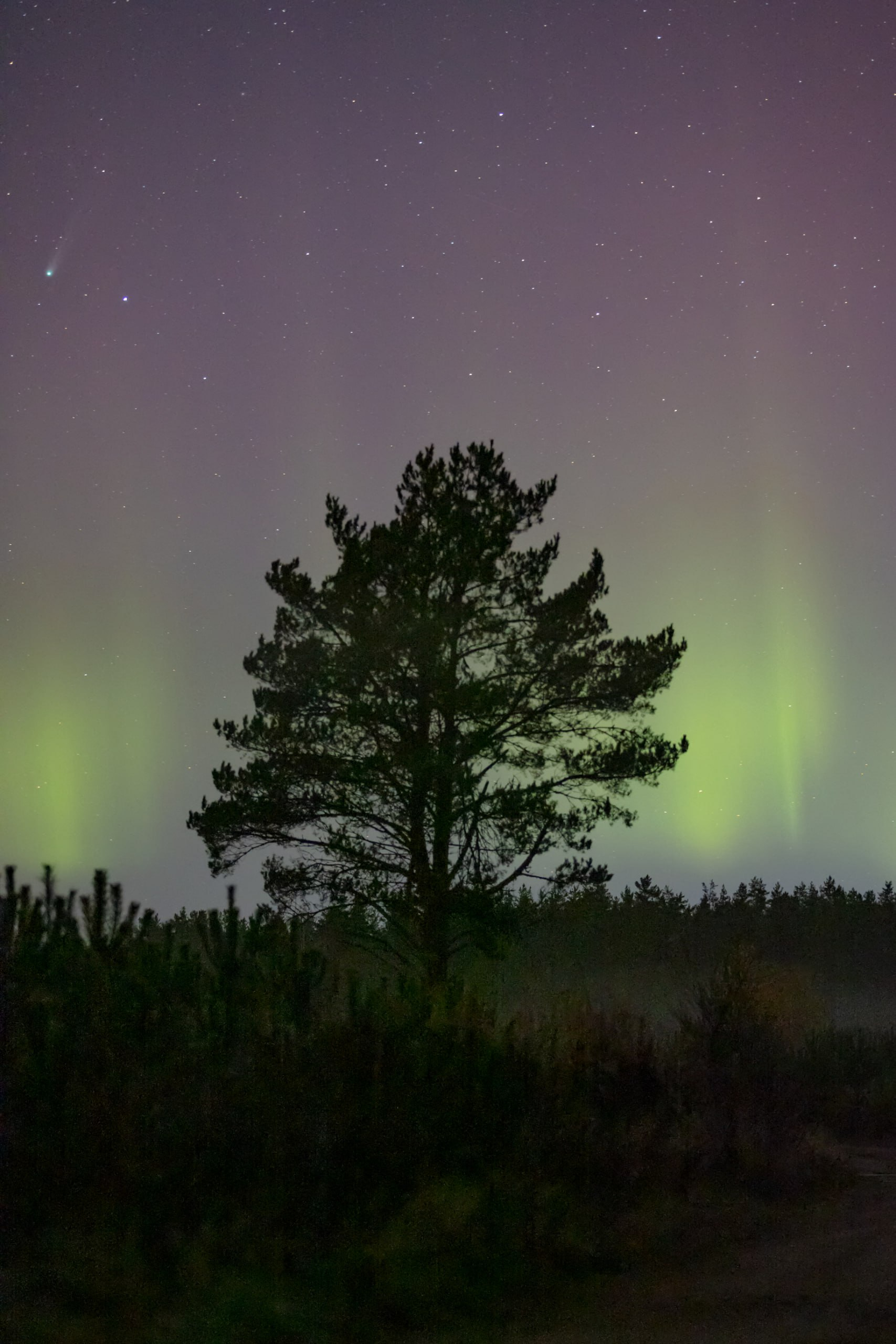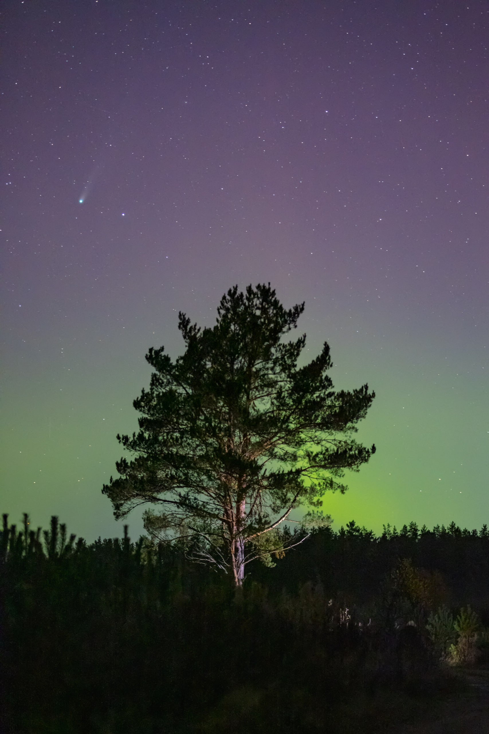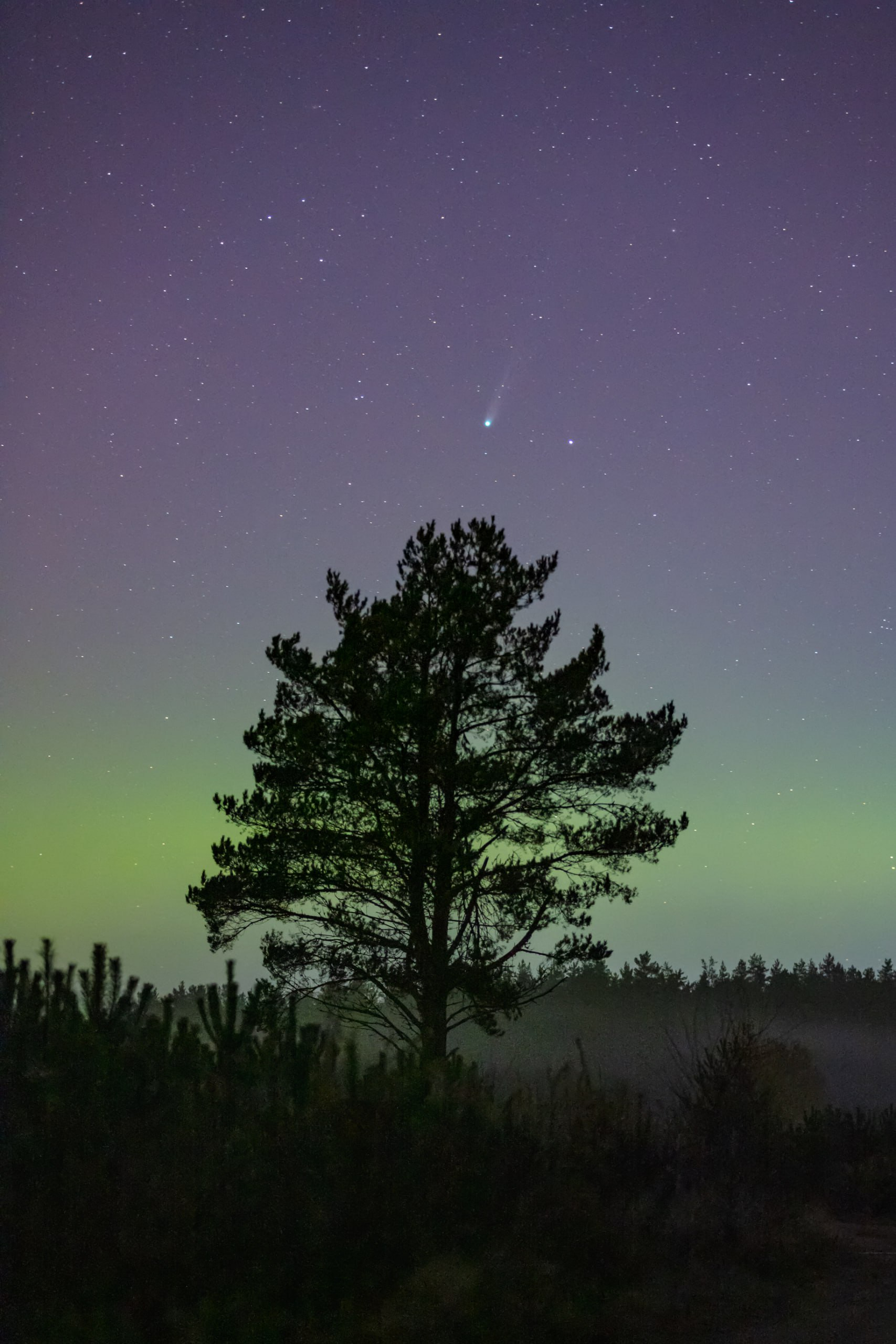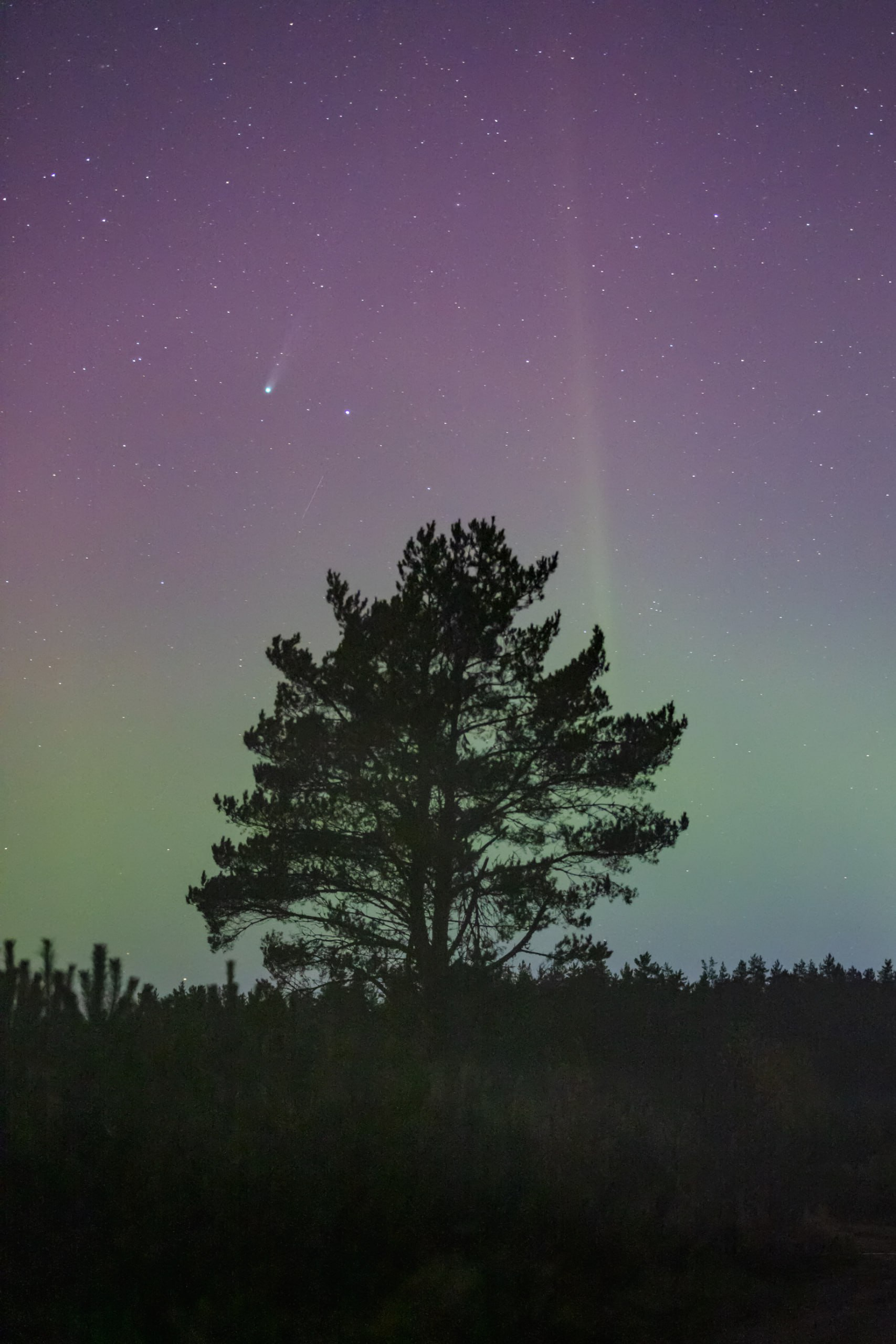 Лучше всего наблюдать за кометой - за городом, после заката и перед рассветом, так как городская дымка и свет фонарей мешают обзору. В это же время по небу летало множество метеоров, один из которых попал на кадр вместе с кометой.
