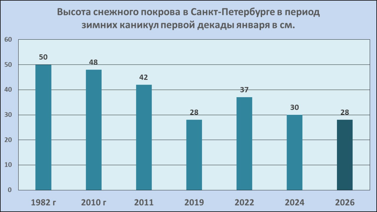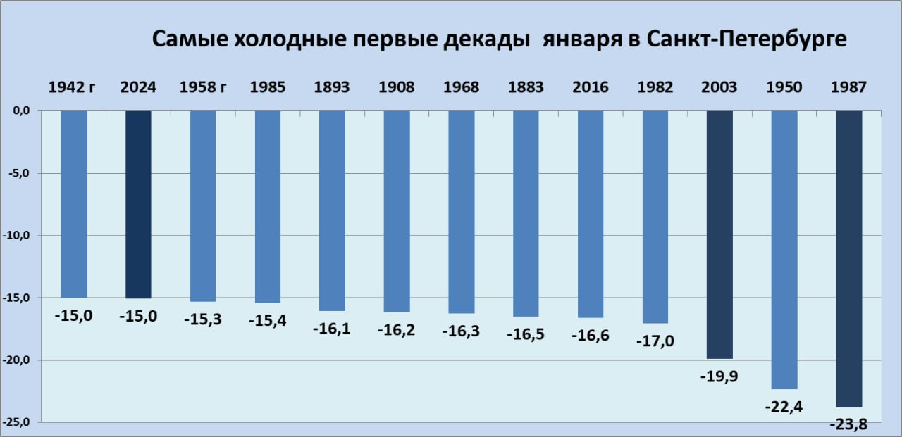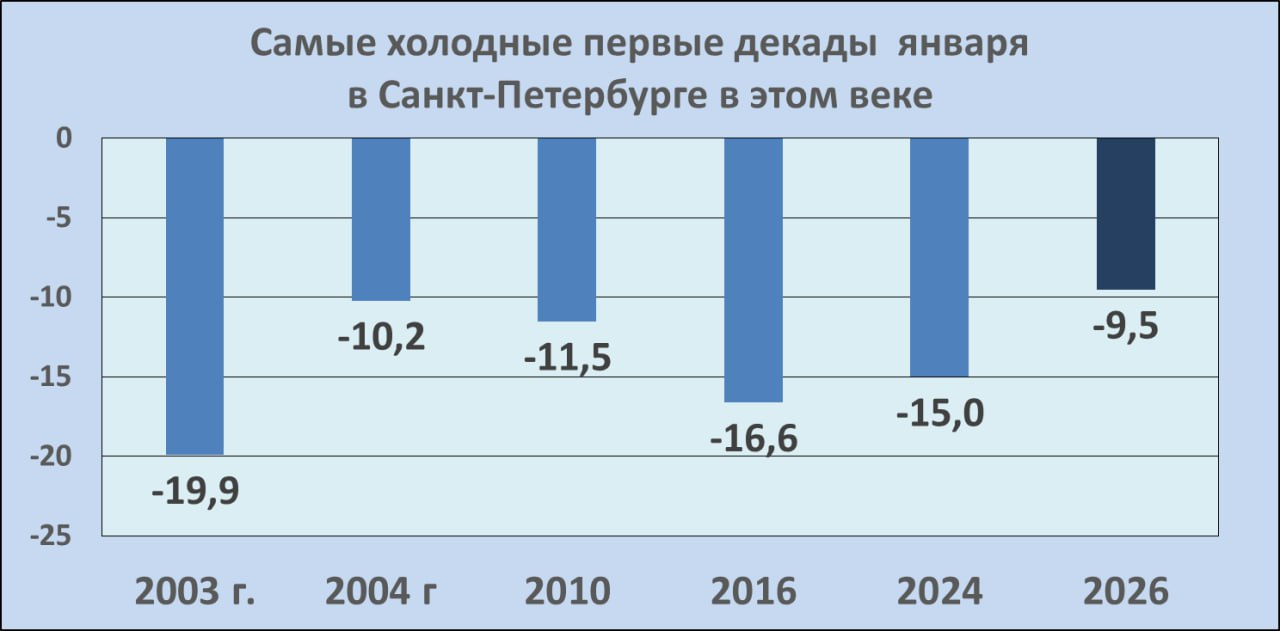 Синоптик также подвёл итоги первой декады первого месяца года, отметив, что с 1 по 10 января в Санкт-Петербурге было достаточно холодно и снежно: средняя температура составила −9,5 градуса, что делает это начало года шестым по холоду за последние 25 лет. Самый холодный день пришёлся на 5 января, когда было −17,7. Выше −4 градусов температура не поднималась.