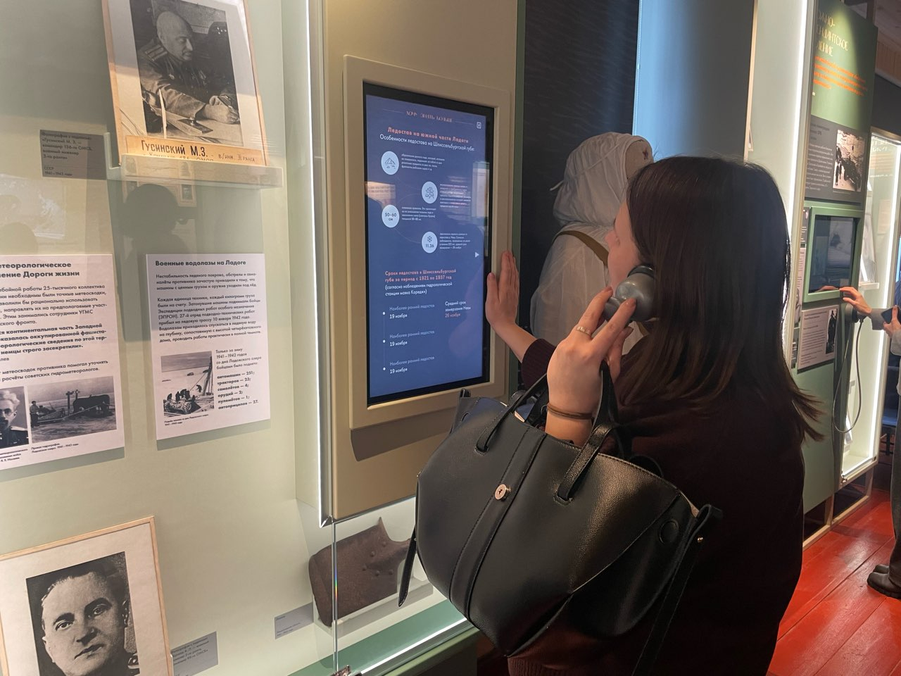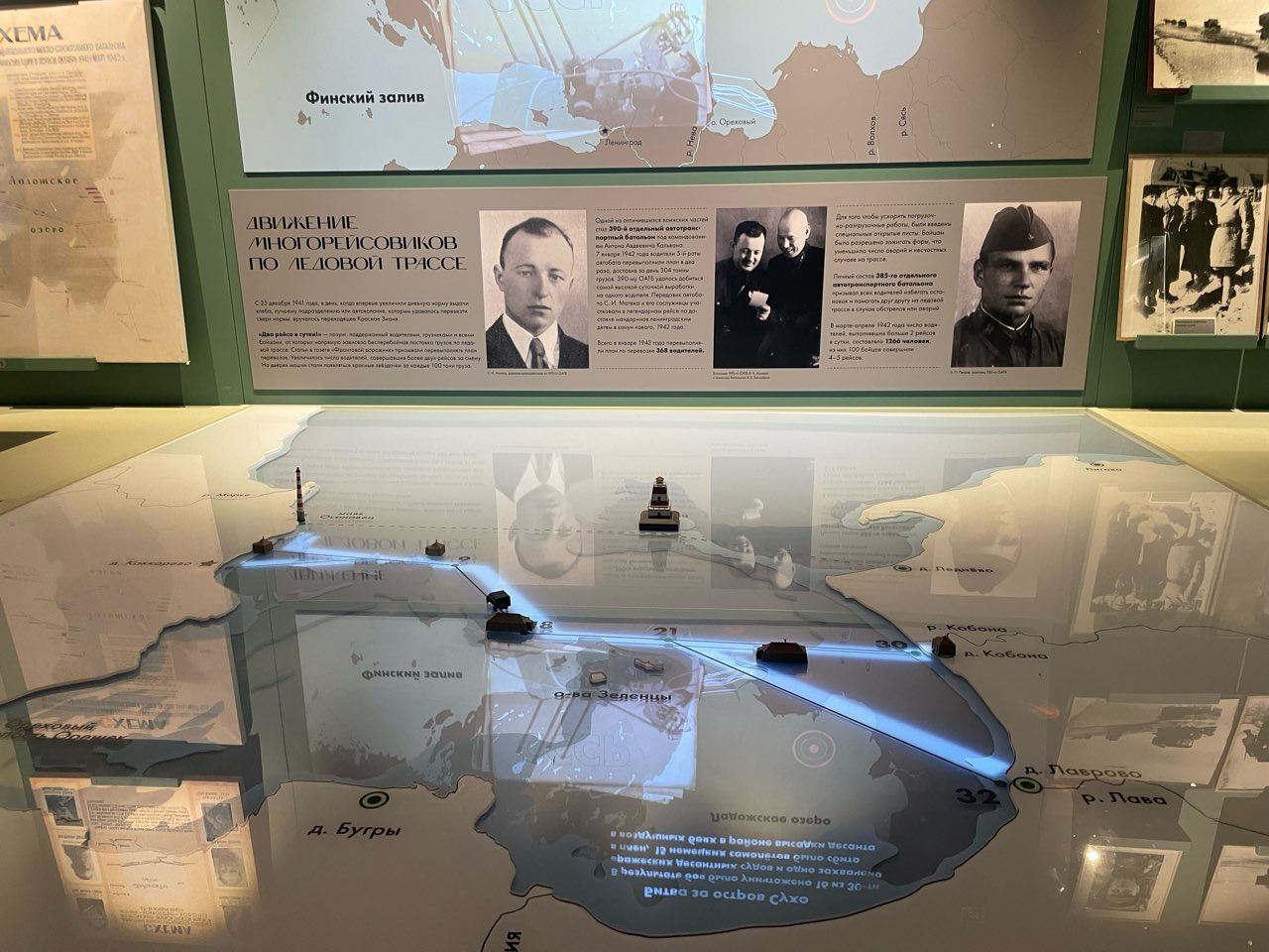 Раздел "Люди Дороги жизни" посвящен первой блокадной зиме. Здесь посетители увидят подлинные схемы трассы, архивные фотографии, записи из дневников и редкие экспонаты. Благодаря карте-макету можно изучить различные объекты: узлы связи, медицинские и ветеринарные пункты.