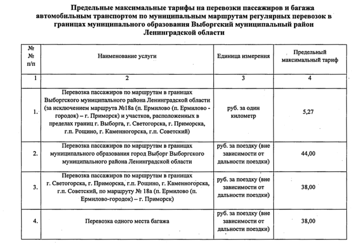 Согласно данным, перевозка пассажиров в границах Выборгского муниципального района, за исключением маршрута №18а (Ермилово — Приморск) и участков, расположенных в пределах границ Выборга, Светогорска, Приморска, Рощино, Каменногорска, Советского, составит 5 рублей 27 копеек за один километр. Стоимость билета по маршрутам в границах административного центра составит 44 рубля. Проезд в автобусе в Приморске, Рощино, Каменногорске, Советском и Светогорске будет стоить 38 рублей.