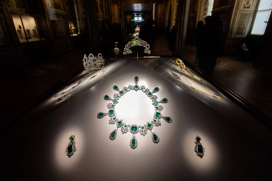 Двое поднялись на подъемнике к балкону дворца и прорезали стекло болгарками, двое оставались внизу на скутерах. Преступники вскрыли витрины и похитили украшения из коллекций императрицы Марии-Луизы (ожерелье и серьги), королевы Марии-Амалии и голландской королевы Гортензии де Богарне (колье, серьги и тиару), а также императрицы Евгении (две броши, бант для лифа и тиара).