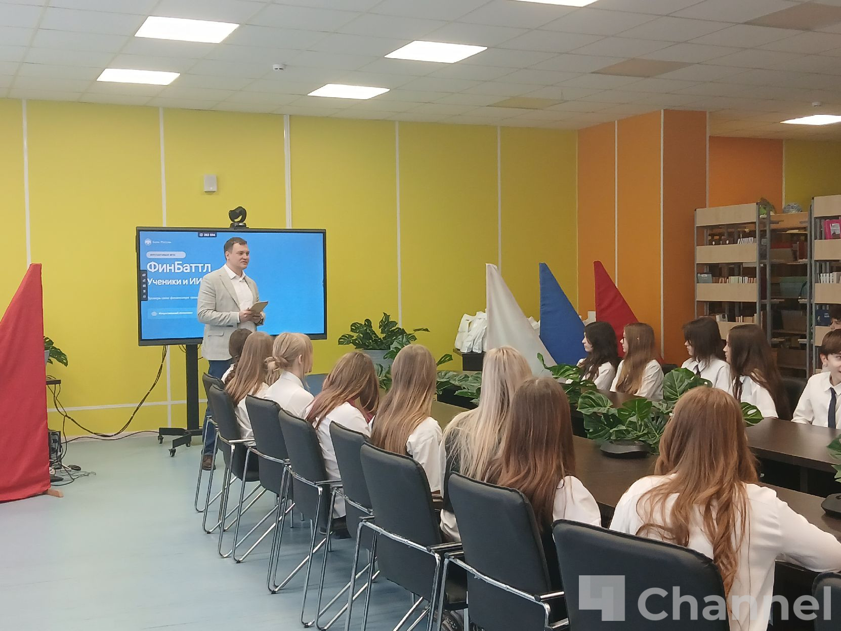 Для учеников организовали интерактив "Финбаттл: ученики и ИИ", где ребята выполняли задания, подготовленные с использованием искусственного интеллекта. Всем участникам вручили памятные сувениры. Затем школьники отправились в компьютерные классы, чтобы пройти олимпиаду.