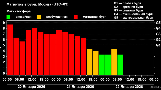 Завершилась первая сильная магнитная буря 2026 года - одно из крупнейших событий XXI века. Геомагнитные индексы вышли из красной зоны ещё 21 января около 16:00 по Москве и стабилизировались на уровне Kp=3–4, который отделяет спокойную магнитосферу Земли от слабовозмущённого состояния.