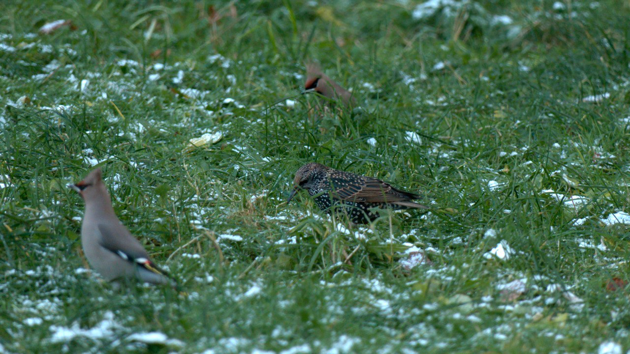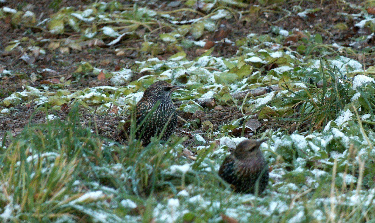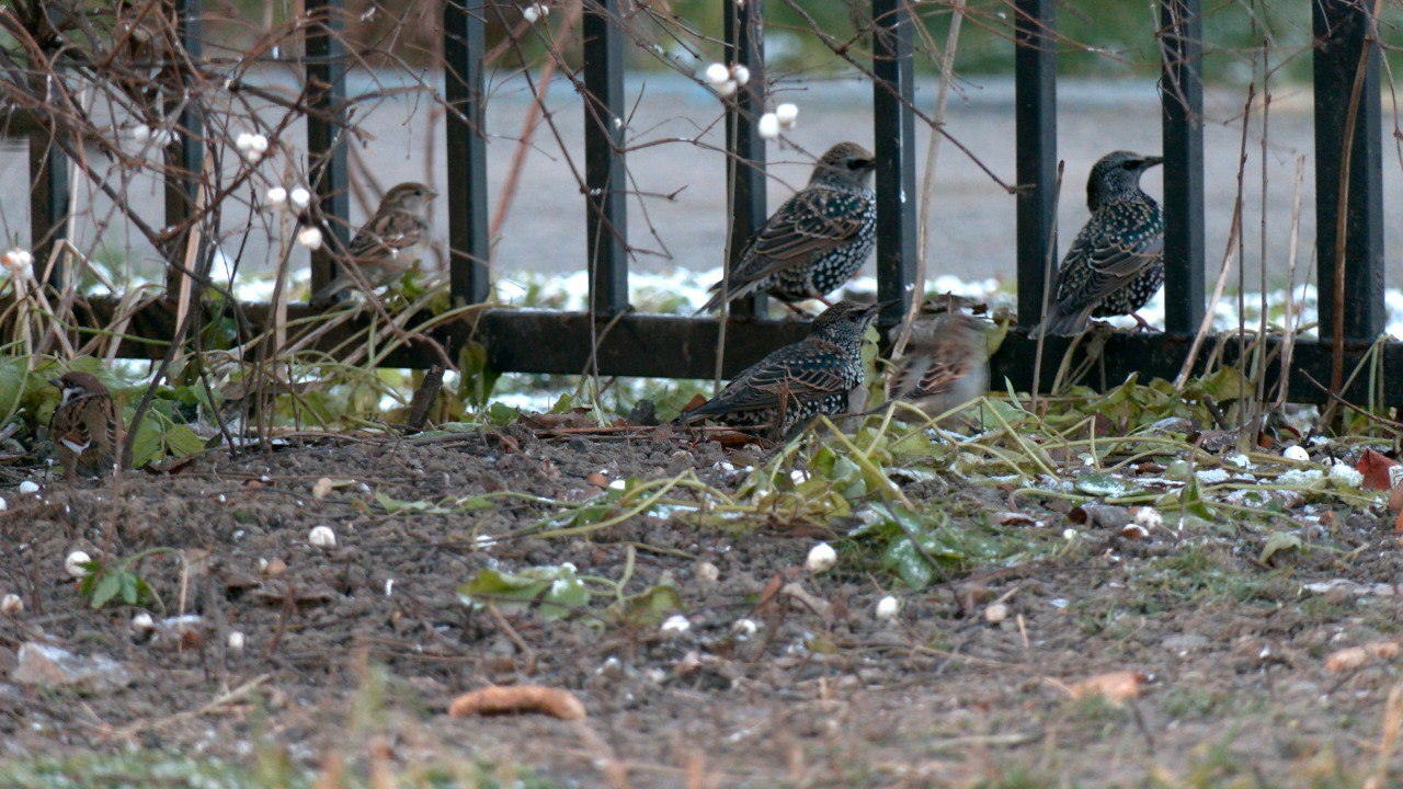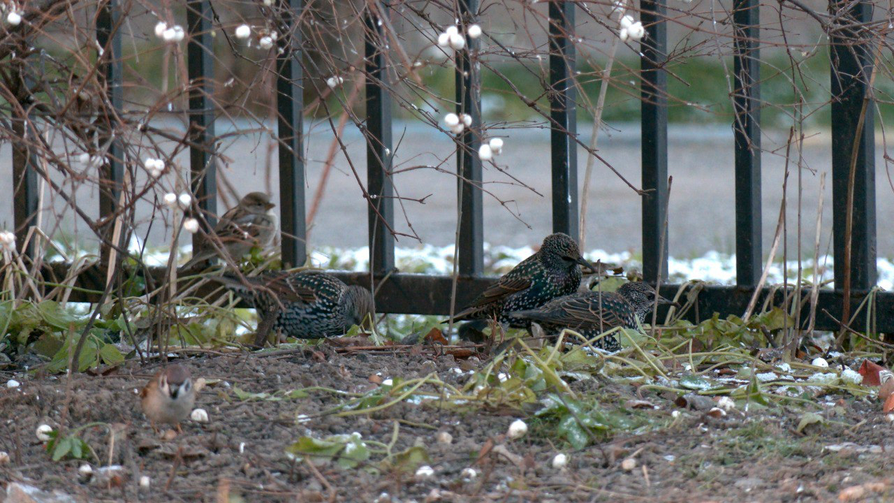 В настоящий момент птицы находятся в своем зимнем наряде. Их черное оперение усыпано белыми пестринами. К началу весны светлые кончики перьев обносятся, и скворцы предстанут в привычных переливчатых «фраках».