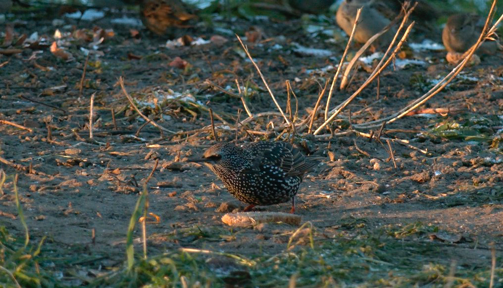Основной пищей скворцов являются насекомые. Однако зимой в городе птицы приспособились питаться пищевыми отходами. В этом году они также лакомятся рябиной и мелкими яблоками. В оттаявших участках земли скворцам даже удается находить насекомых.