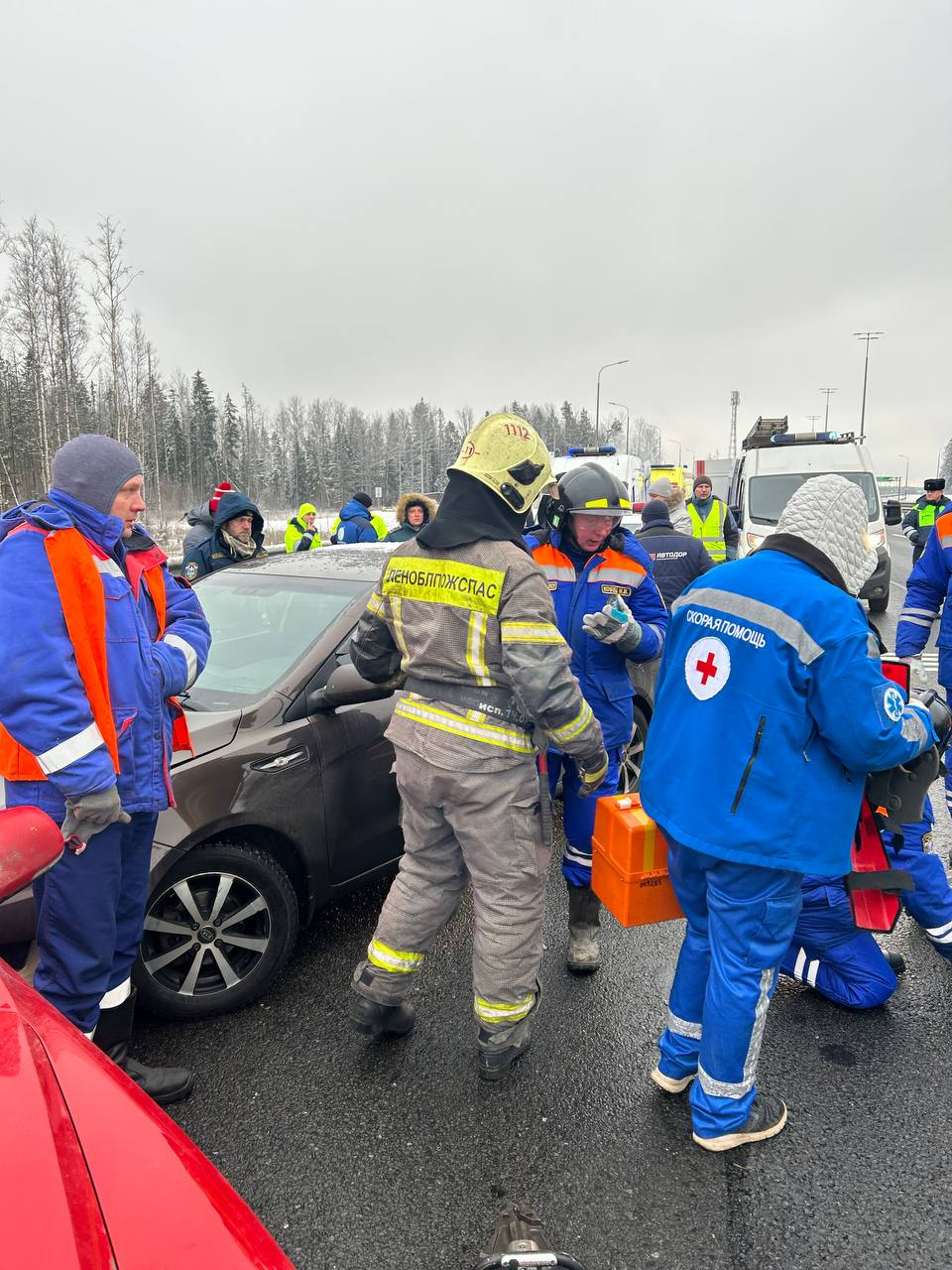 Участвовали пожарные и аварийно-спасательные подразделения Леноблпожспаса, сотрудники МЧС России, ДПС ГАИ, бригады скорой помощи, аварийные комиссары, санитарная авиация и дорожные службы.