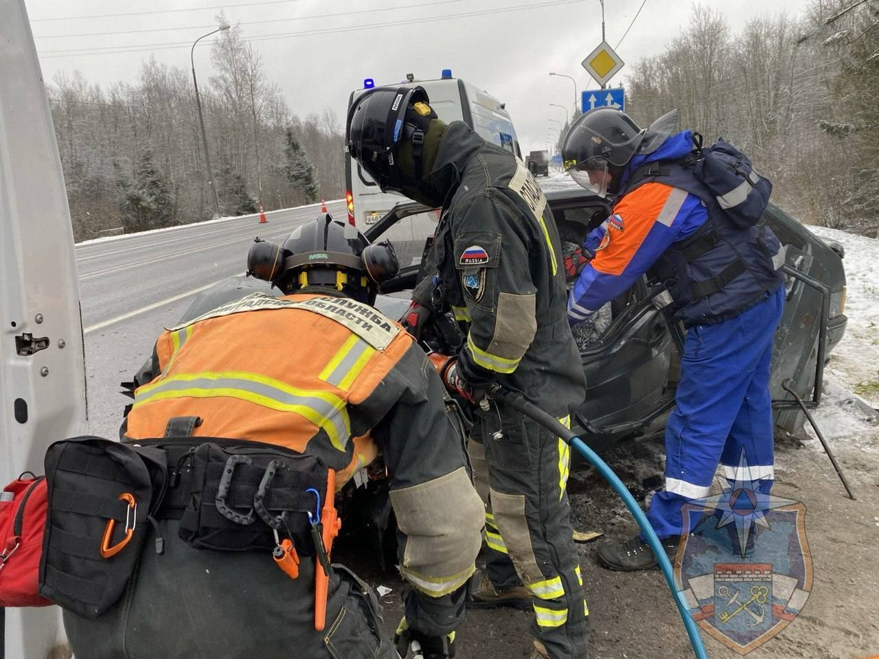 Спасатели поисково-спасательного отряда города Тосно освободили пострадавшего, передали его медикам и отключили аккумулятор машины.