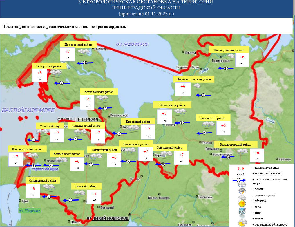 В субботу, 1 ноября, в Ленинградской области будет пасмурно. Атмосферное давление пойдет на повышение. Ветер - восточных направлений, силой до 2-7 м/с.
