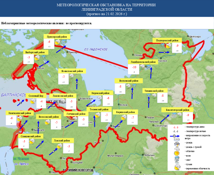 В субботу, 21 февраля, на территории Ленинградской области ожидается облачная с прояснениями погода. Температура воздуха в течение суток будет варьироваться от -1 до - 19 градусов, сообщили в ФГБУ "Северо-Западное УГМС".