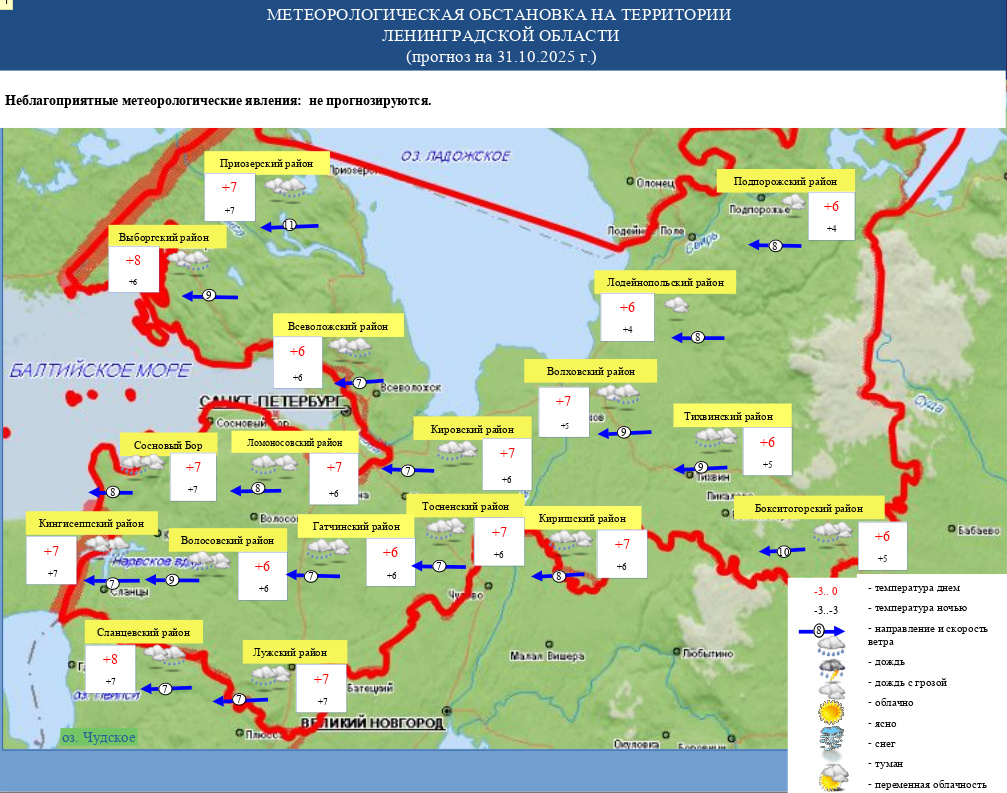 В пятницу, 31 октября, в Ленинградской области прогнозируется облачность, а еще юго-восточный и восточный ветер до 5-10 м/с.