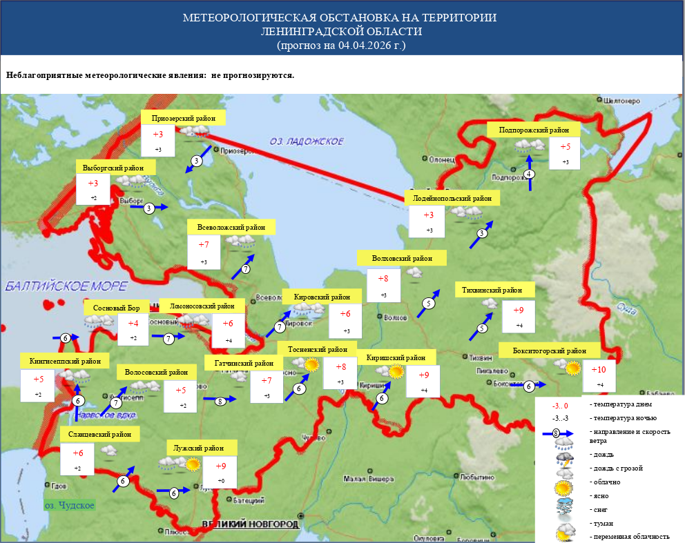 В субботу, 4 апреля, в Ленинградской области прогнозируется облачная погода с небольшими осадками - в основном это будут дожди. Также возможен туман.
