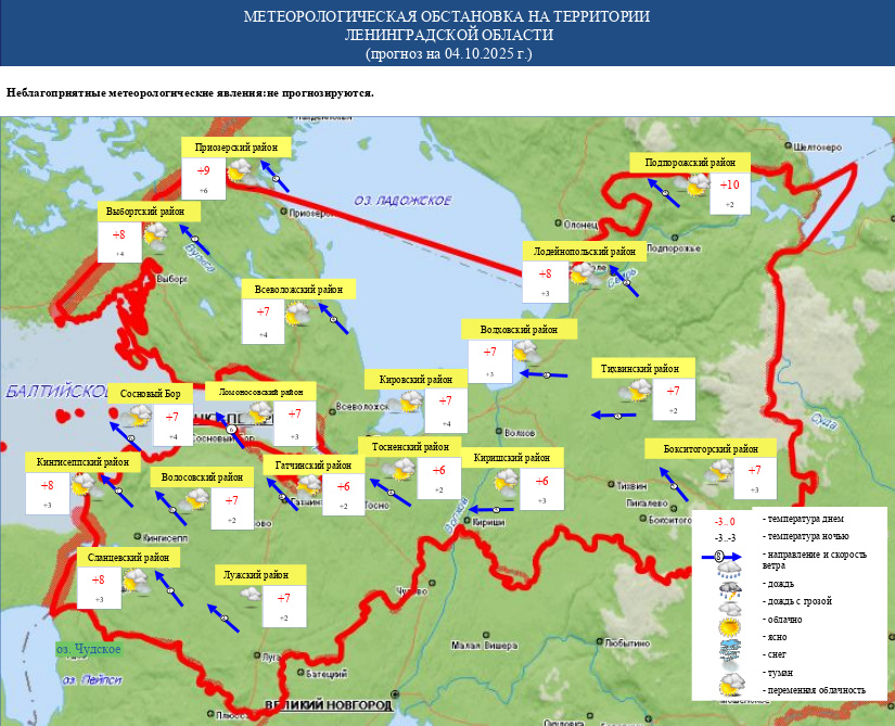 В субботу, 4 октября, в Ленинградской области прогнозируется облачность с прояснениями и без особых осадков. После заката местами вероятен туман. Атмосферное давление пойдет на понижение.