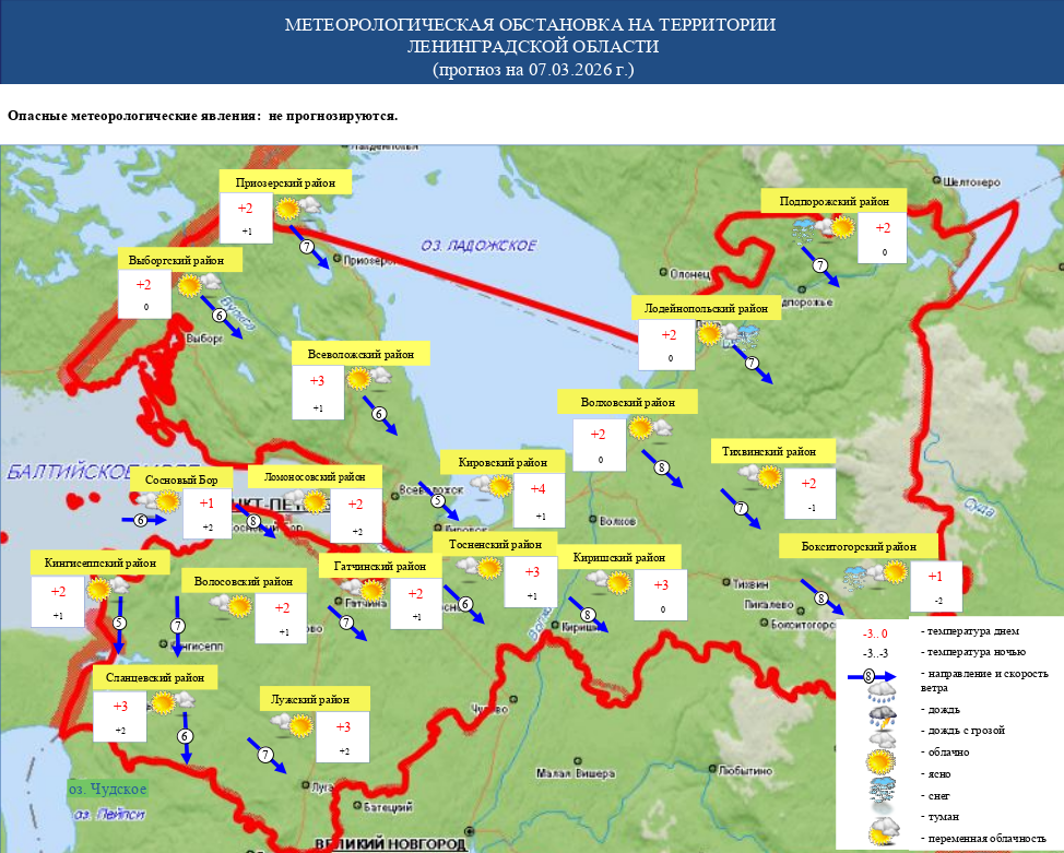 В субботу, 7 марта, в Ленинградской области прогнозируется погода без особых осадков, хотя в ранние часы на востоке вероятен небольшой мокрый снег. Ветер - западный и северо-западный.