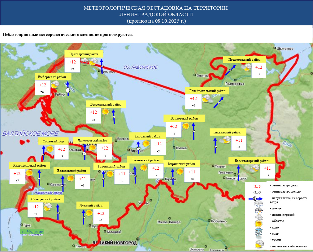В среду, 8 октября, в Ленинградской области прогнозируется облачная с прояснениями погода и без особых осадков. После заката местами вероятен туман.